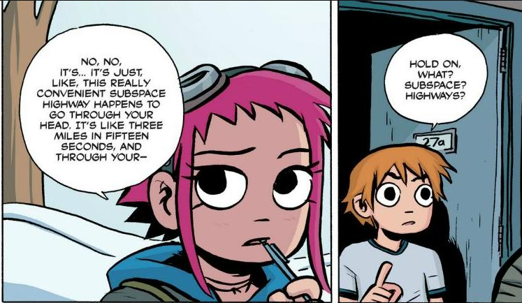 In terms of abilities and weapons, Ramona has her hammer, the Power of Love, a titanium bat, the glow, and the ability to open up subspace rather easily. The hammer and bat serve an obvious, yet beautiful purpose of course. The Power of Love is different in that equipping it can heal as far as impalation and gives a (unquantifiable) stat boost, yet lacks the “je ne sais quoi” of bashing a person’s head in. The glow basically turns on all the emotional baggage someone has on them, but it honestly doesn’t seem to be very combat capable as it only works when Ramona is feeling an extreme emotion. Maybe since this is a fight to the death, you could argue that’d bring out those emotions, but that’s kind of pushing it. The best thing Ramona has going for her in this fight however is subspace, which gives her a variety of escape options as well as a possible BFR option.