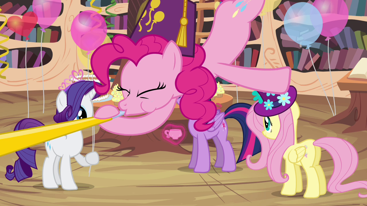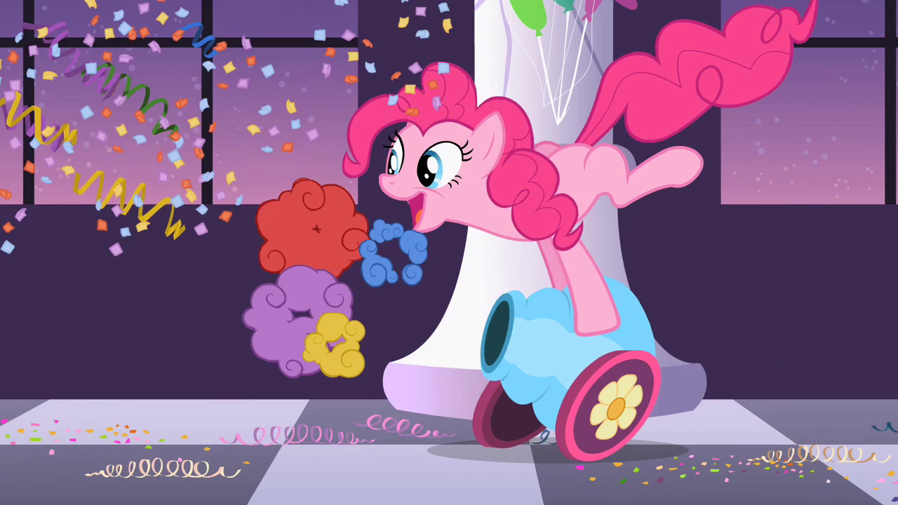 When Rainbow Dash’s sonic rainboom cleared the clouds and painted a rainbow across the sky, the shock wave frizzled Pinkie Pie’s hair and gave it its distinctive curl. The sonic rainboom that she witnessed made her smile, and she then decided to dedicate her life to spreading joy to other ponies. She invited her family to their first party ever, and they all shakily developed smiles, eventually merrily participating in Pinkie’s party. It was then that Pinkie earned her cutie mark.