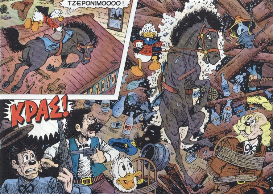 Thanks to his courage and audacity, Scrooge explores the deserted White Agony Creek and manages to find the Goose Egg Nugget, an abnormous gold nugget that was deemed to be a mere legend by the other gold diggers. This causes him to gain notoriety in the town, but not in a good way: the gold diggers began to harass the scottish duck and take the mick out of his family’s recent tragedies (the duck avenges his honor by going berserk against them all), and by doing so he attracts the attention of singer (and heavily implied prostitute) ”Glittering” Goldie O’ Gilt. Scrooge soon meets her in her saloon, and it’s love at first sight for him; however, Goldie had other plans, as she drugs him to steal the nugget and all of his gold. Scrooge doesn’t give up however; he returns to the saloon, beats up all of her men, forces her to write a one thousand dollars I.O.U., takes his properties back and kidnaps her, forcing her to work as a miner for him, underpaying her even.