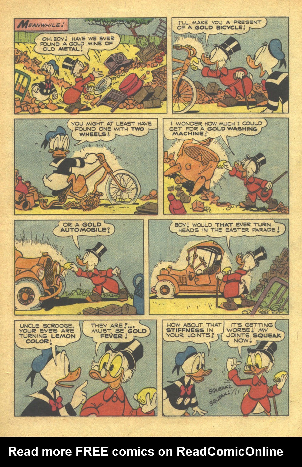 To recover from the heartbreak, Scrooge kept mining gold, making affairs all over the world and became a billionaire. He then moved with his sisters to the desolated Duckburg, Calisota, which he turned into a metropolis, also building his legendary moneybin in it.