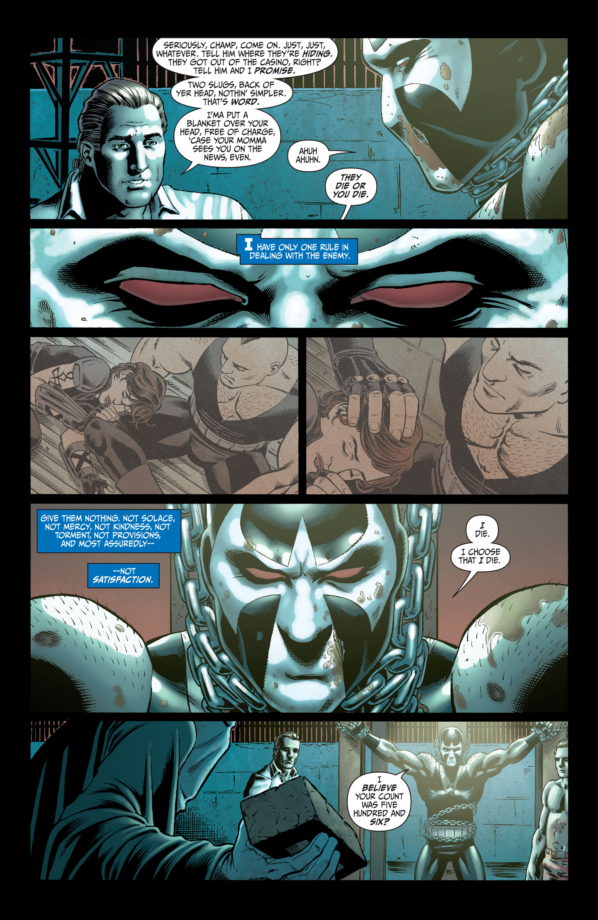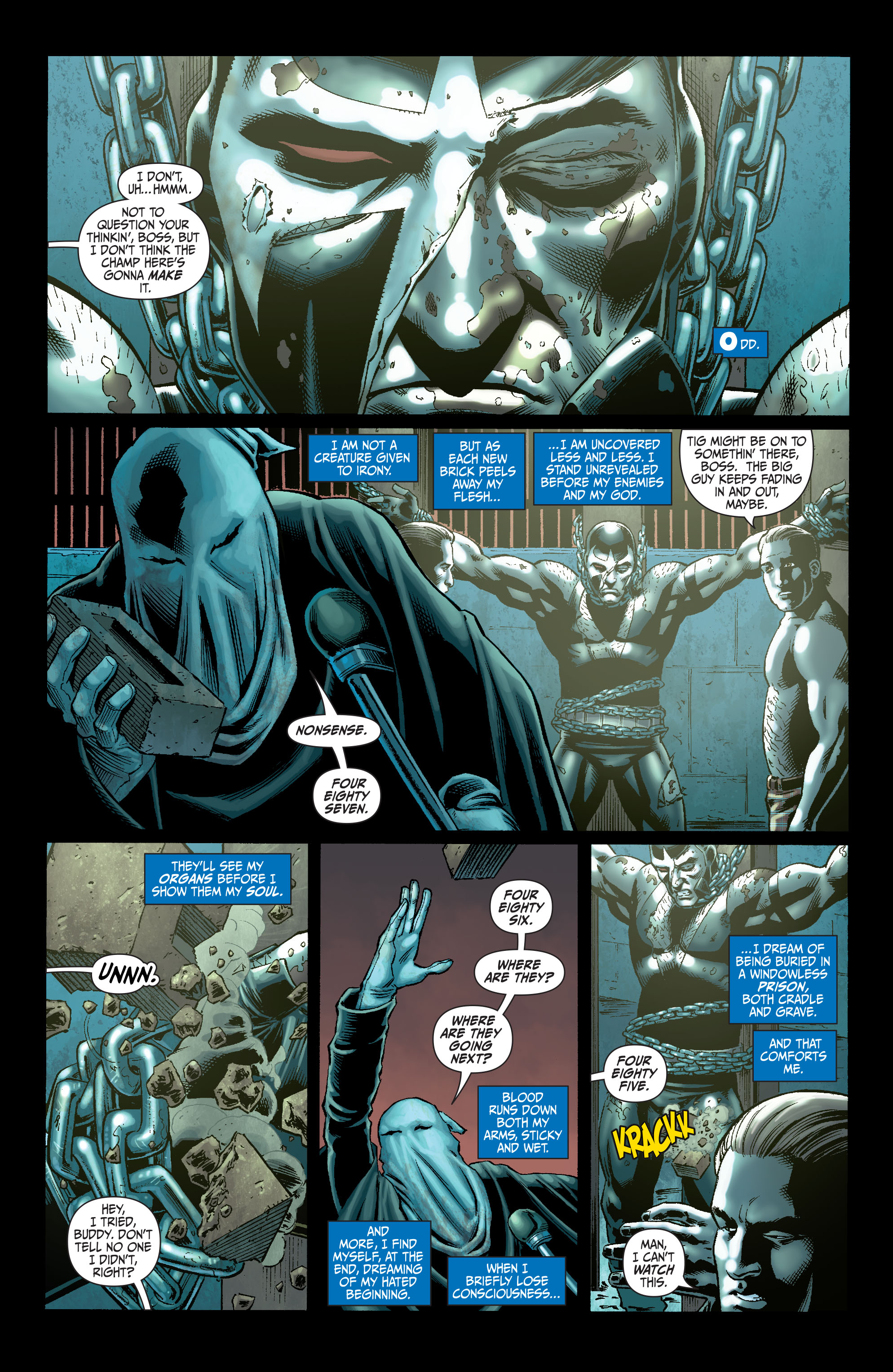 - Over the course of a torture session, gets a bunch of bricks thrown at him with enough force to shatter them.