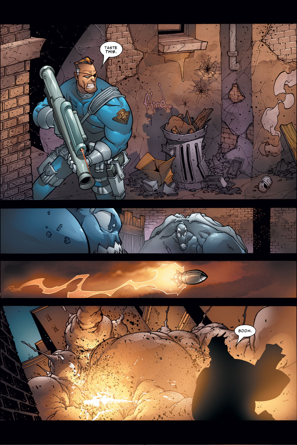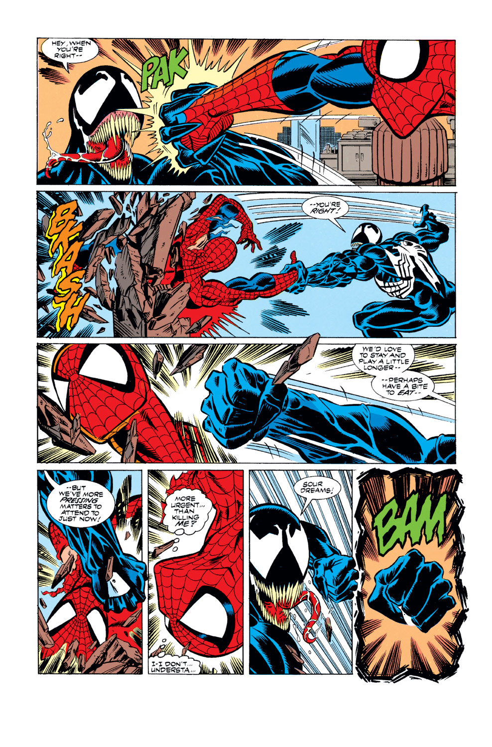 …But then Spider-Man had plenty of experience dealing with Venom and knows of his fire and sound weaknesses, so he was actually able to exploit them in some way, and half the time he’s just lucky with what’s lying around the area at the time. Meanwhile Bane won’t know about any of that, and from what I know he doesn’t have any fire or sound-based attacks, so that’s out the window. Unless the two somehow start a fire and the alarm goes off, but that isn’t happening. And even then, Venom’s built up some resistance to those anyways, so God knows how much it would actually help Bane out.