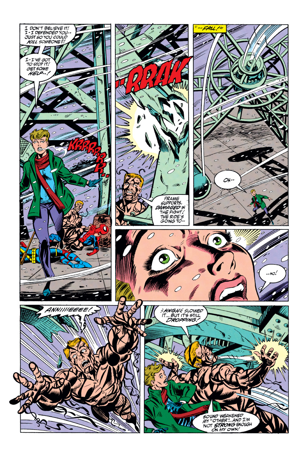 - Pulls down multiple rooftop fixtures and bits of wall, that Spider-Man manages to catch with webs.