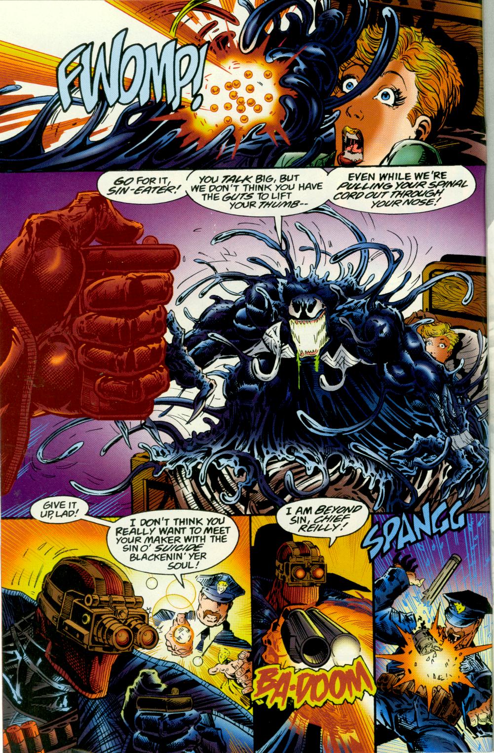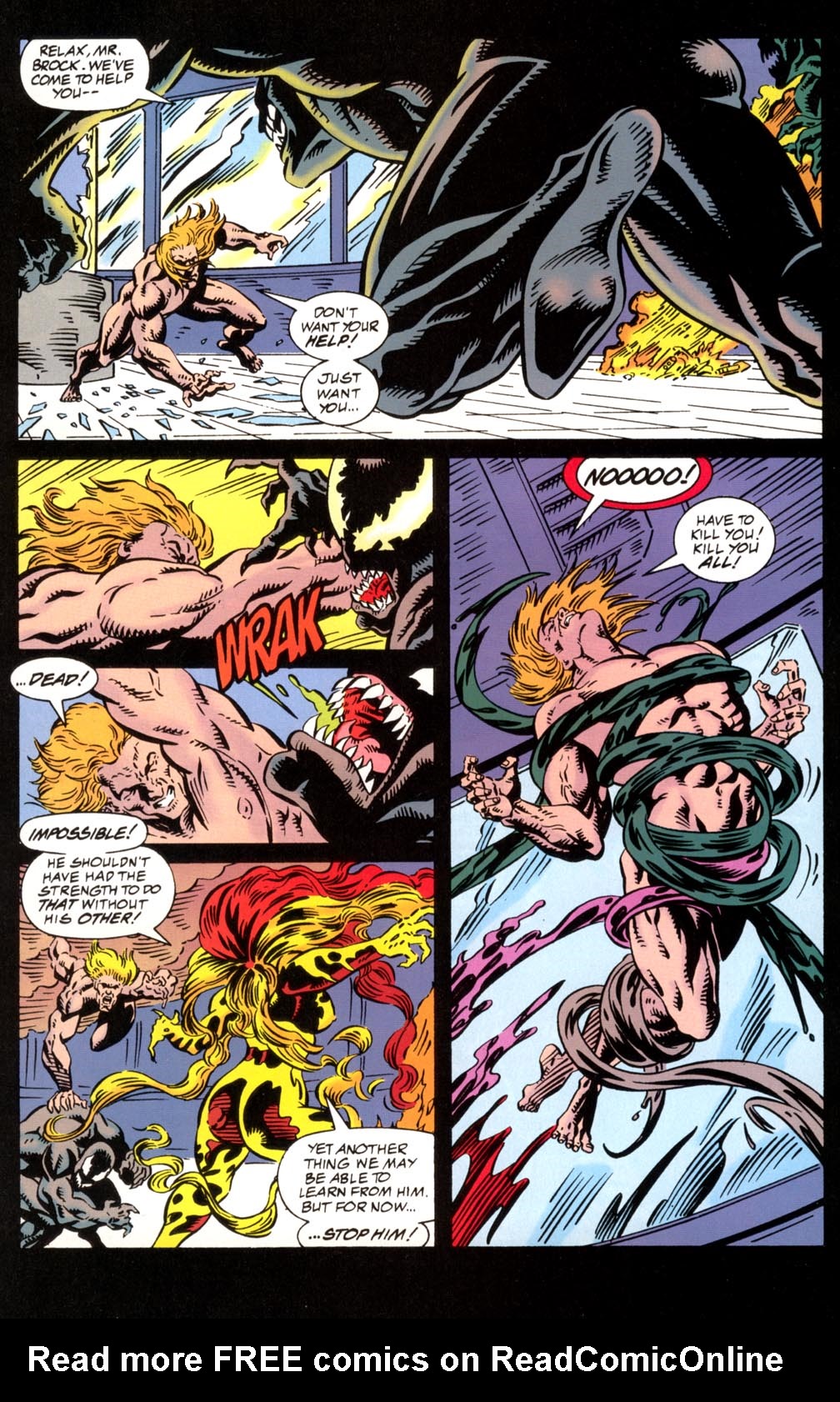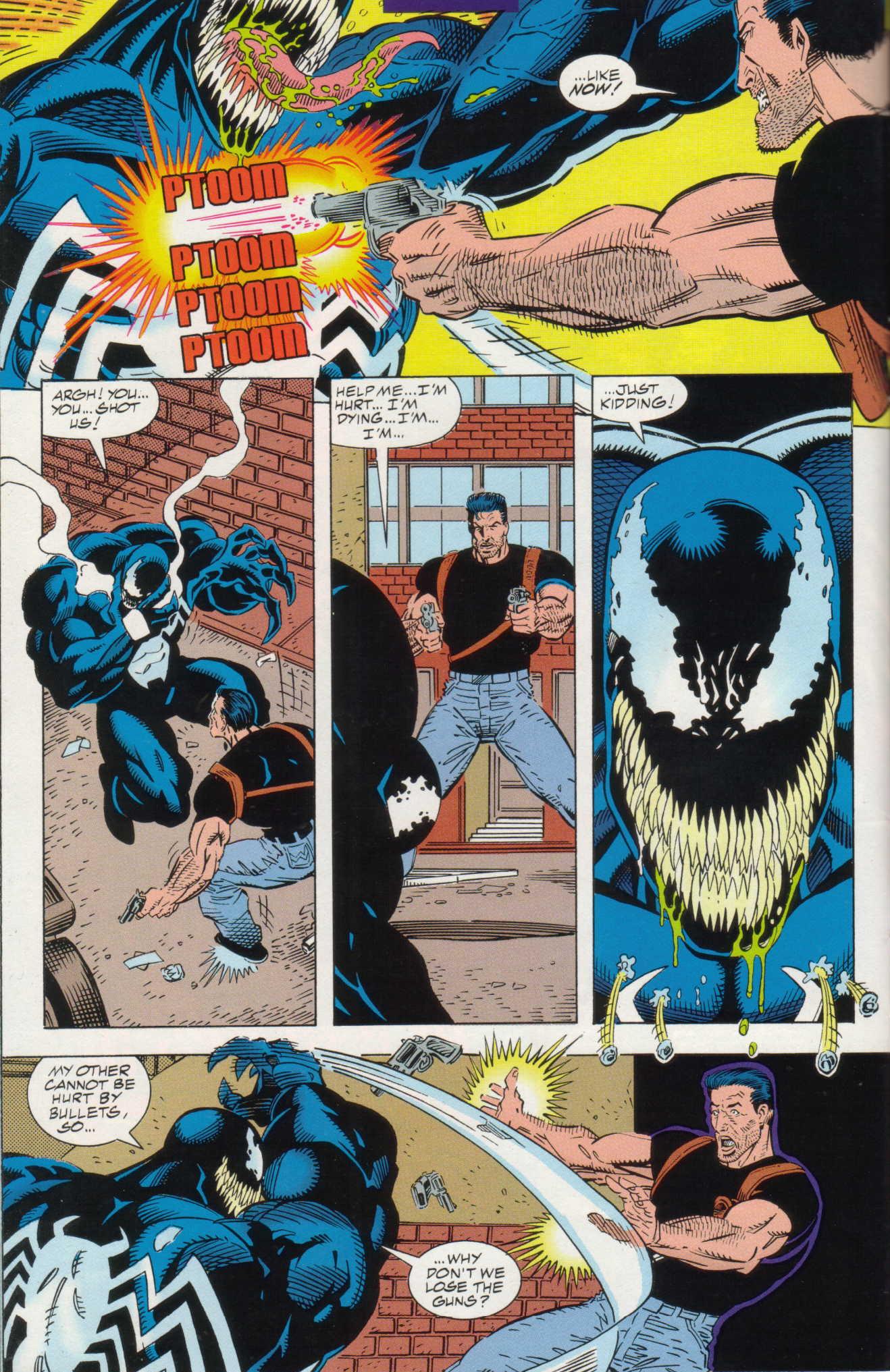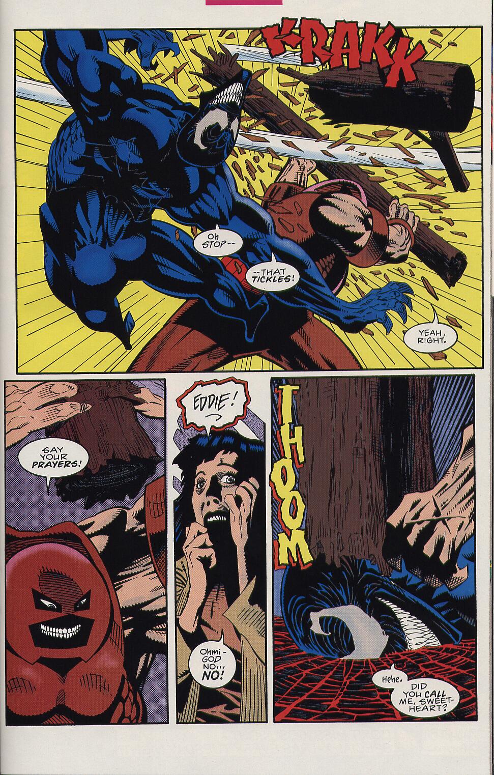 - Has no weaponry which exploits Venom’s weaknesses to flame and sonic weaponry. Even if he did, Venom has been shown to resist such attacks in spite of his weakness.