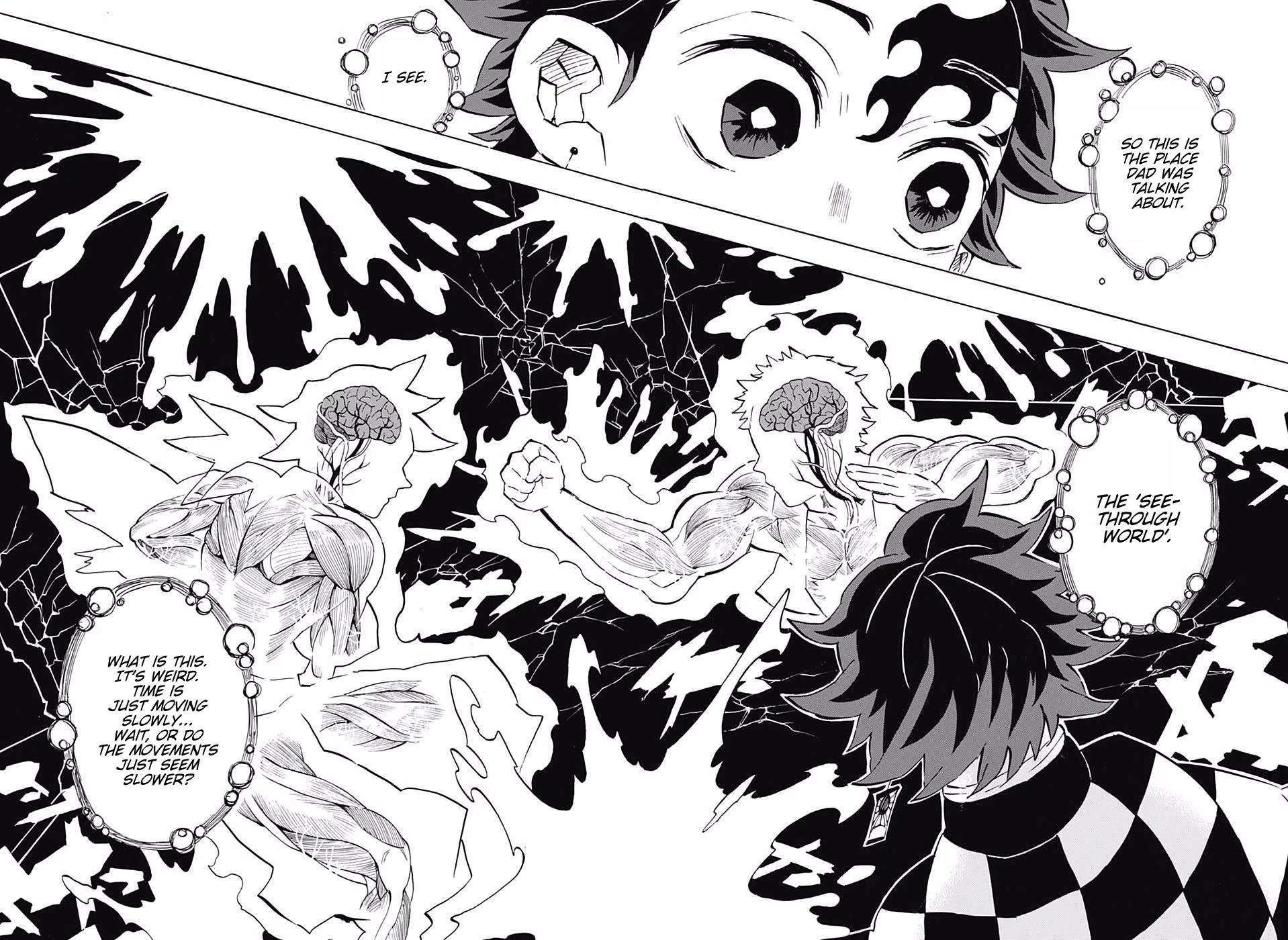 Just his father, Tanjiro gains the ability to foresee an opponent’s attack while showing no battle spirit and sense of blood-lust. This allows him to achieve immunity from anyone who can sense these. In this state, Tanjiro’s movement intuition and evasion speed increase dramatically due to a gain in hyper-perception. Because of this, he perceives the world around him at a much faster rate, making the world appear to him in slow motion. Tanjiro can enter the “see-through world” by becoming aware of every part of his body and “closing” any unneeded actions out like one would close their eyes when trying to hear something. By seeing through an enemy, Tanjro can observe muscles, blood vessels, lungs, and all their contractions and accurately predict and react to his opponent’s movements, as well as confirm the health and well-being of others.