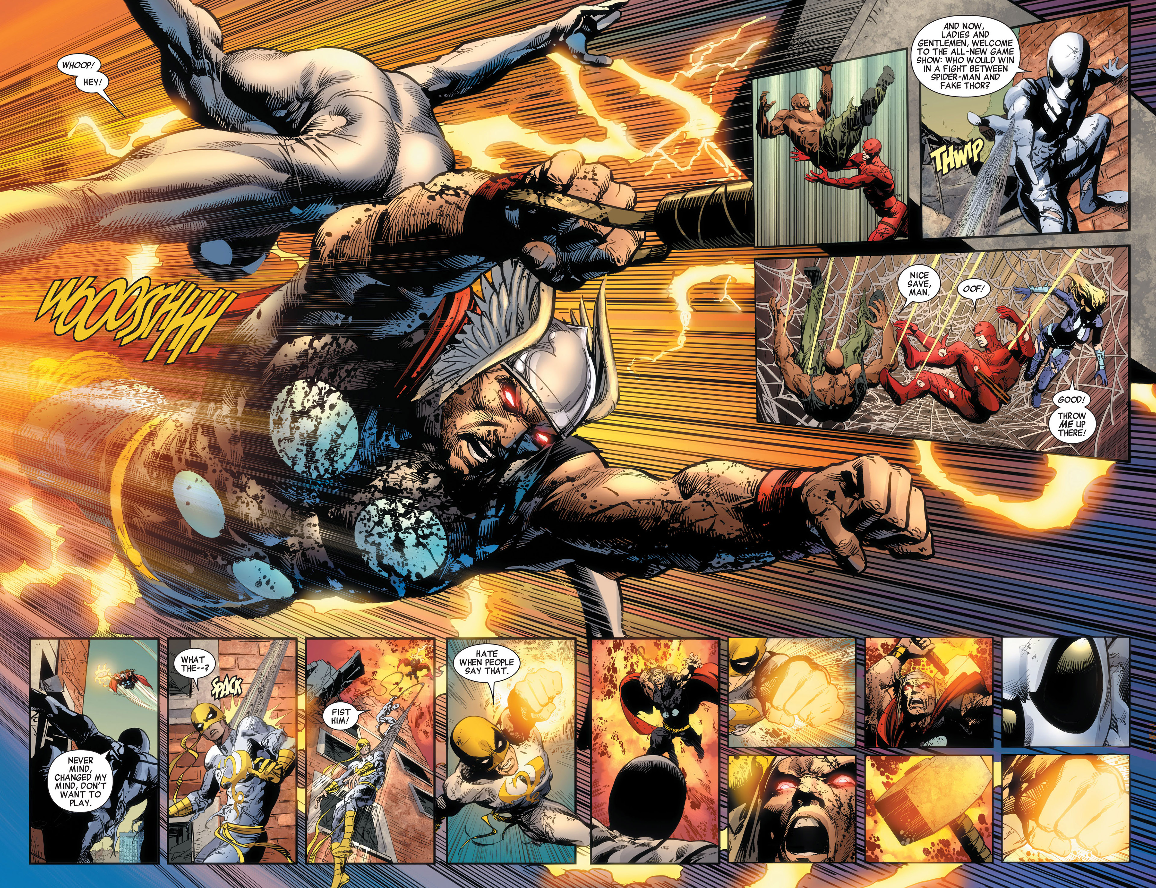 Speed-wise, Iron Fist is a Marvel street tier, so he’s pretty damn quick. He’s comparable to or upscales from characters like Captain America and Daredevil, who can react at the speed of light or within the span of nanoseconds, respectively. That, and he can keep up with Spider-Man tiers, who can dance around Cyclops’ lightspeed Optic Blasts. Lightspeed to FTL stuff is pretty set in stone for the character. You can potentially argue he scales to suppressed Heralds in speed at least, since he can tag some of them, but many of these are likely unreliable for the same reasons that scaling power-wise is unreliable: a lot of these Heralds could be holding back. A lot. Still, pretty quick, befitting the mightiest of Marvel street tiers. That said, Po can somewhat close the gap with the perception boost he gets from the Eyes of Bushido technique, so it might not be that big of a hurdle.