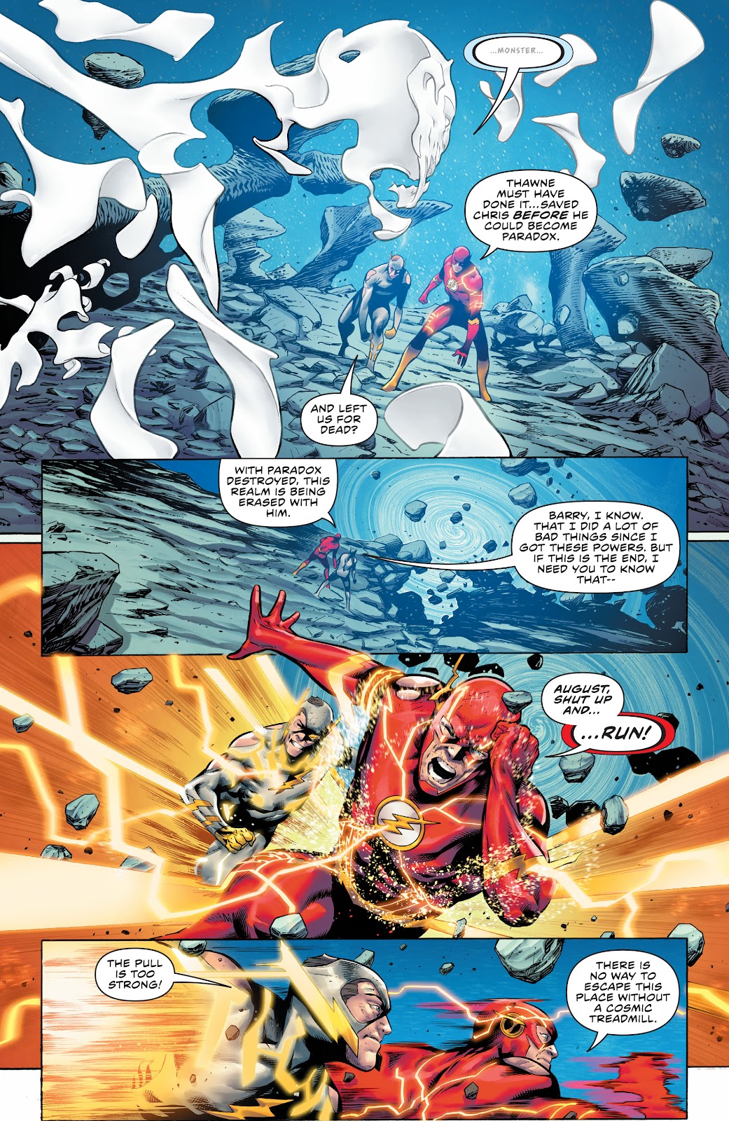 Thawne has set an explosive trap on the cosmic treadmill that, when activated, disperses atoms across the past and future through the time barrier. The shock waves from the blast were capable of tearing Flash apart in less than 3/100ths of a second if he hadn’t acted.