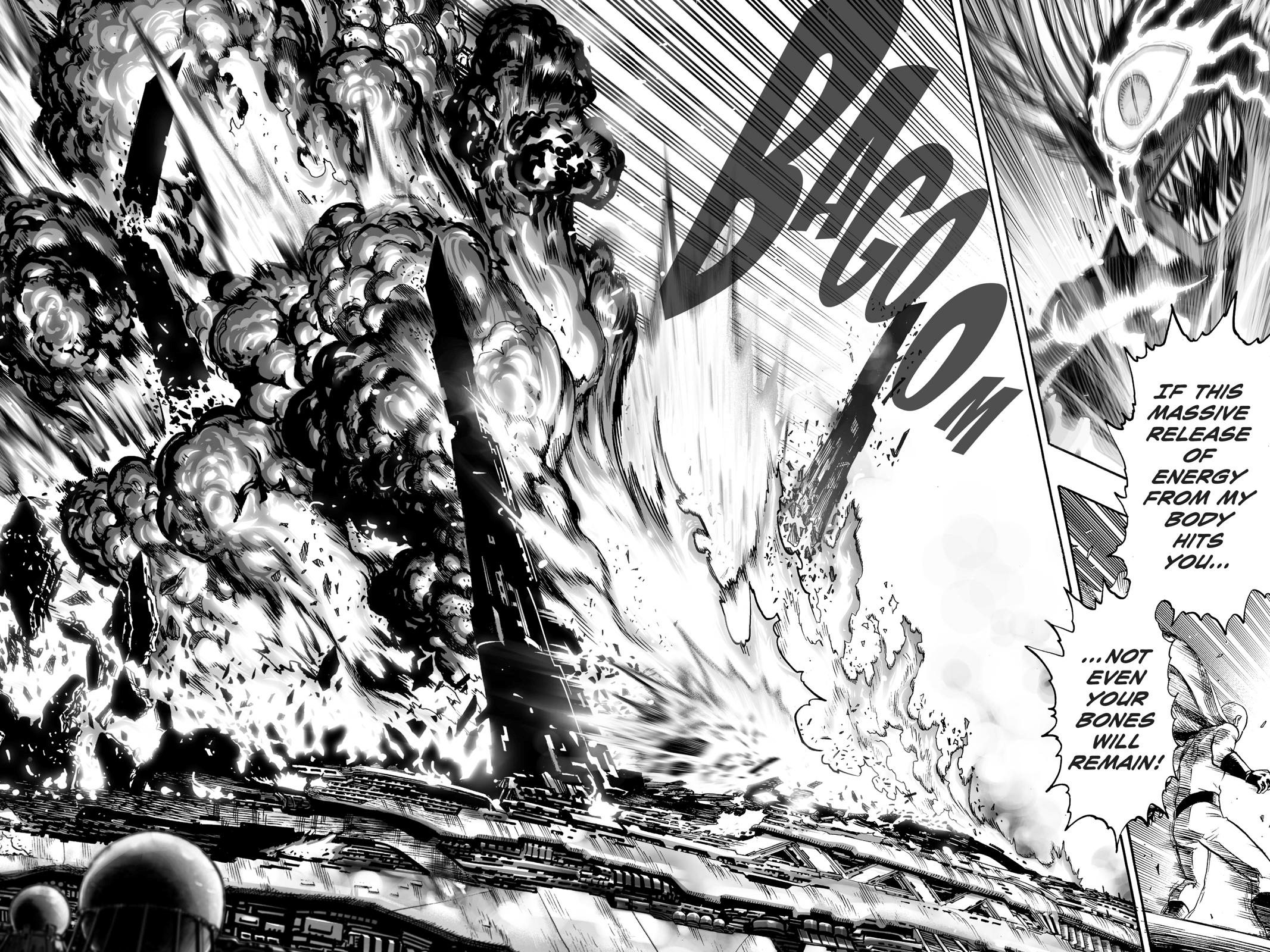 Saitama on the other hand is pretty easy to pin down even though we haven’t seen him go all out in a fight. With his serious punch Saitama cancelled out Boros’ Collapsing Star Roaring Cannon which could destroy the planets surface (183.24 petatons of TNT). In order to cancel out Planet Attacks – Saitama would need to be outputting an equal force in order to cancel it out. The anime further back this up as in the anime, Boros can fully destroy the earth, as explained here with the One Punch Man Compass also stating that Boros has enough energy to destroy entire planets. (while they are translations that hint that Boros can destroy stars – that is likely a mistranslation. Either way, at the moment the best that we can put Saitama at is Planet Level (which is further based up with characters Psykorochi having planet level feats). Saying that Saitama is Star level requires a lot of dubious assumptions and believing some mistranslations. Either way I feel like planet level makes the most sense based on what has been shown so far.