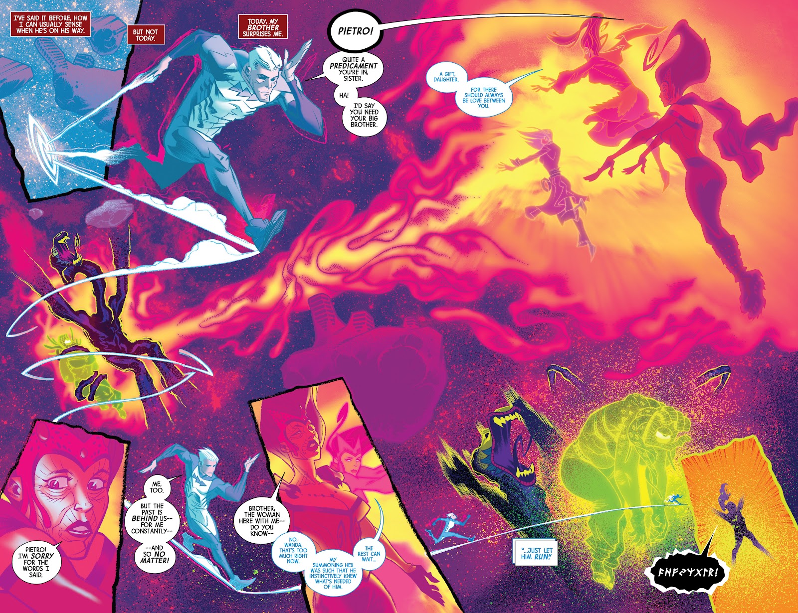 Next, we move onto speed. These two might not seem like speedsters but they’ve certainly got some good scaling. In Wanda’s case, she even has some very interesting feats. Zatanna should bare minimum scale to DC herald speed feats which can range anywhere from quintillions of times faster than light to straight up immeasurable speed. Hell, if you scale Zatanna to speedsters or a Superman at his absolute, absolute best, you’d be scaling her to speed feats so potent that they break and transcend the very concept of speed itself. This is DC we’re talking about so that’s no surprise. The question is, can Wanda match this? And the answer is yes. Yes, she can. Marvel herald speed feats also range from quintillions of times lightspeed to immeasurable but in most of those cases, they do fall short of DC. Not in this case though. Wanda has amplified Quicksilver’s speed to where he could run beyond space, time, and reality. And at one point, she even amplified her own speed there to match that of Quicksilver’s. Wanda can keep up with characters like Thor & Doctor Strange who have immeasurable speed feats and just like Zatanna, if you go with some higher up speed scaling, you can get Wanda to a point where her combat speed breaks and transcends the very concept of speed itself.