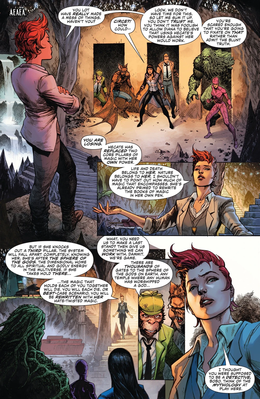 In terms of speed, Zatanna’s comparable to other Justice League members who all have insane showings, such as Hal Jordan crossing the universe in a heartbeat at over 9.4 duodecillion times faster than light, or Superman, Wonder Woman and Hal Jordan breaching the Speed Force with their sheer speed. Other feats include Superman flying fast enough to push through the barriers of time, space, memory, and emotion, Shazam fling to the Rock of Eternity which is beyond time and space, or Doctor Fate moving through the universe at the “velocity of god” and traveling through quantum singularities into realms of dialectical space and meta-time, all of which are immeasurable.