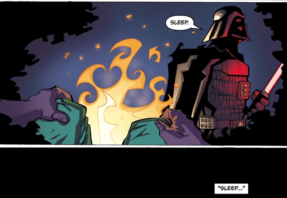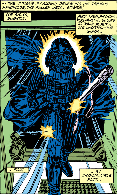 Vader’s main folly was a rack of poor choices when moved by anger, in canon, most notably the decision to abandon pursuing rebels to face down his old master, Obi-Wan. However, decades of battle and enlightenment from the Dark Side have purged these weaknesses from Vader. Anger instead became a lens of focus, and of strength.