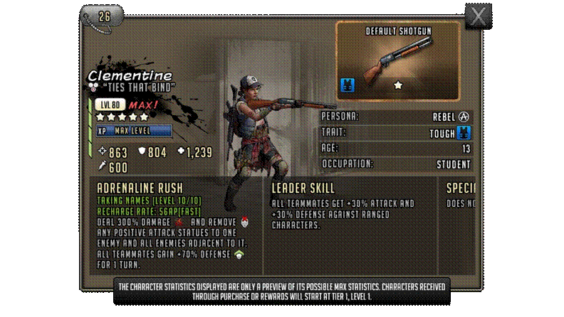 For those who don’t know, Road to Survival is a (canon) mobile game featuring characters from all across The Walking Dead, including Clem. In the game, she is able to obtain various weapons from exploring, or using less savory methods. It should be noted that most of the weapons increase stats, such as: