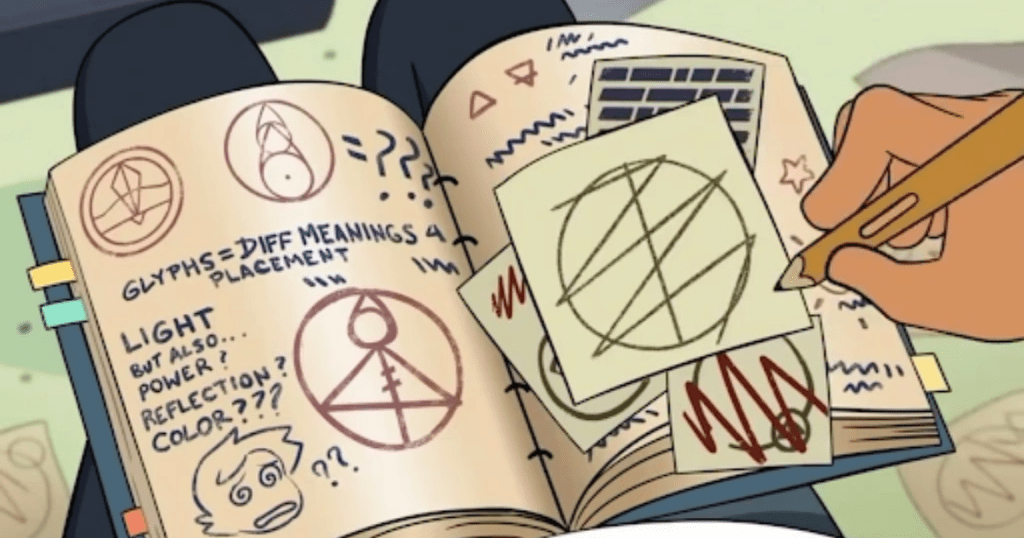 Initially upon arriving in the Boiling Isles, Luz was incapable of performing magic due to lacking a bile sack which is an extra organ in all residents containing a free magic supply. However, after some interactions with nature thanks to her mentor Eda, she was able to spot patterns in her surroundings. Through copying those patterns onto paper, all it would take is a tap and voila, she could do magic by utilizing the natural magic located on the isles. The potency of this magic can be further increased as well depending on how big the glyph symbol itself actually is. Luz can also transcribe the glyphs she’s learned on papers on her person in order to use them, allowing to her to be able to draw more glyphs using her notepad and pen at any time. She carries these glyph papers in large quantities, and isn’t really shown to run out of them. Throughout her adventures, Luz has discovered the following glyphs: