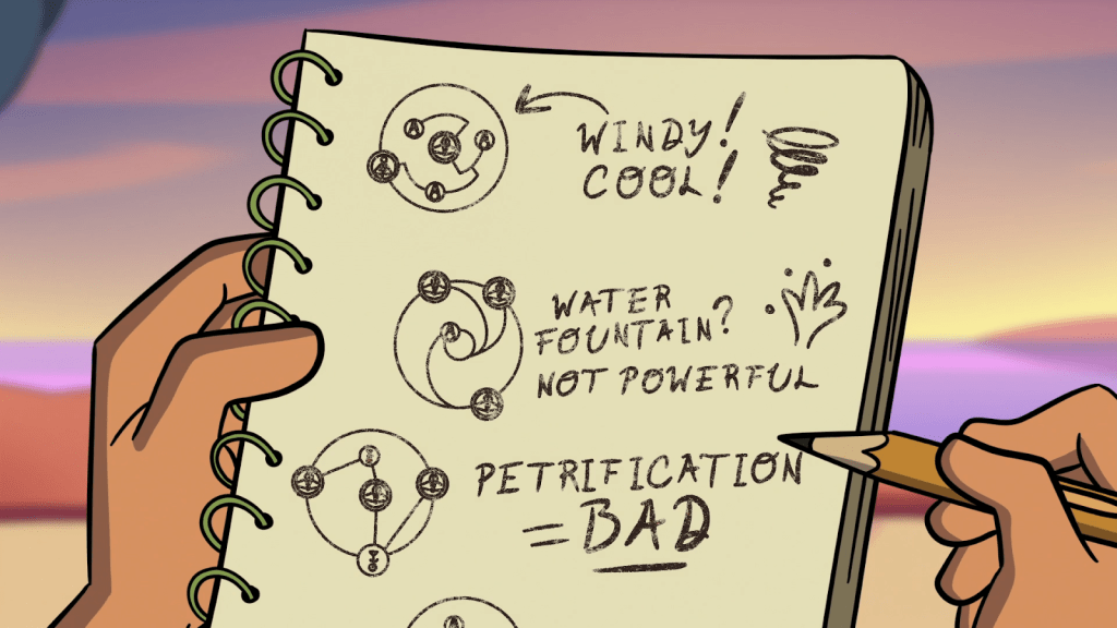 Across the various Owl Pellet shorts and the mainline series itself, Luz has been shown to be extremely proficient in the arts and especially drawing. She’s shown on many occasions that she can find creative ways to trace glyph symbols (with perfect circles courtesy of tracing some manga as a kid) and can draw with whatever she can get her hands on. She also seems to carry pencils/pens on her various adventures based on if she needs to create new glyphs on the fly.