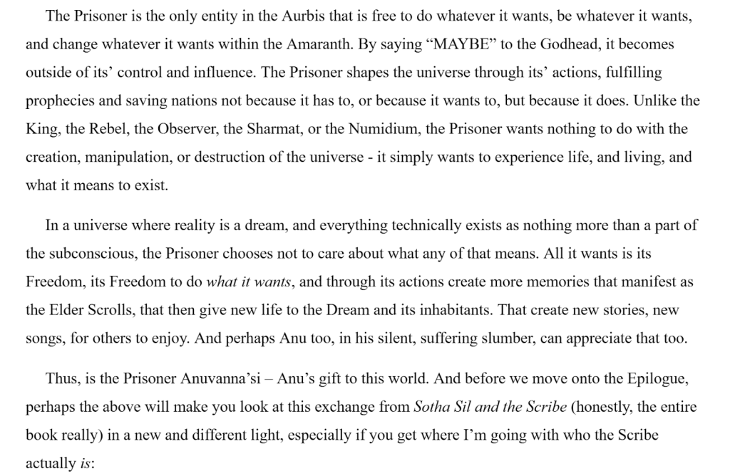 While it is totally understandable to question the implementation of outside of game sources written by the likes of Michael Kirkbride and other writers, there’s a consistency amongst Word of God that at the very minimum these apply to some level of Canon. Many of Kirkbride’s writings have found their way into Main game canon via the form of being introduced in Online or in the canonical novels. In complete honesty you can remove every out of game text referenced in this blog and you still would end up with a cosmic level of power for Elder Scrolls via Online.
