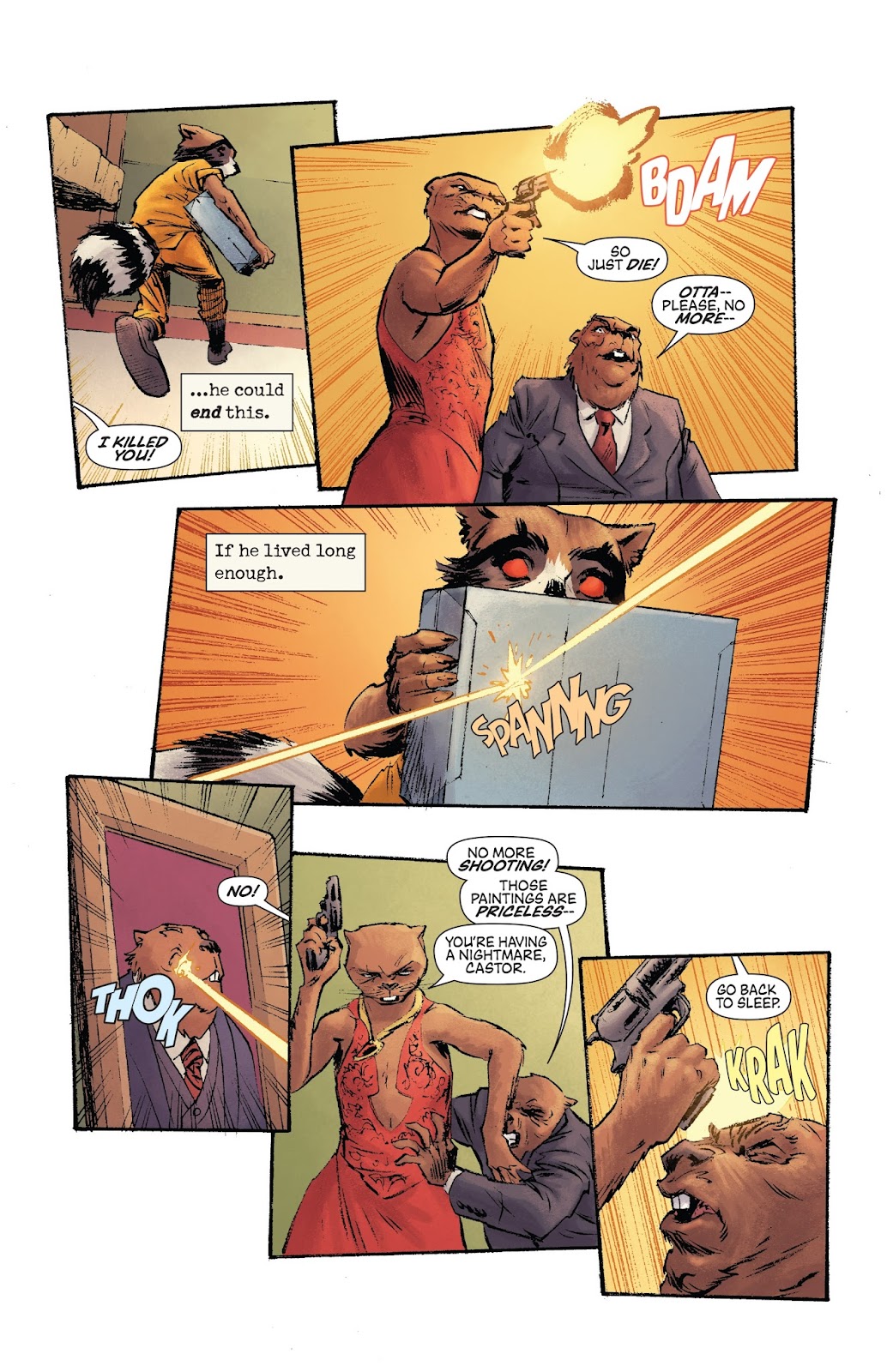 This experience traumatized Rocket for years. He likely fell back on the only good memories he had of Khevix, and adopted his friends’ abrasive attitude and love for combat as a coping mechanism for all he had endured at the hands of the Halfworld robots. Rocket’s newfound interior physiology as well as his exterior persona served him well as a ranger, and before long, he found himself new friends in Lylla the otter, as well as Wal Rus and his magnificent teefs. This phase of Rocket’s life was wild and… dramatic, wrought with relationship drama. He tangled with Blackjack O’Hare, a mercenary rival, who married Lylla (who had previously been Rocket’s girlfriend), then got divorced and blamed it on our beloved trash panda. Eventually, however, Rocket set off on his own journey through the cosmos, leaving behind his Halfworld friends and enemies.