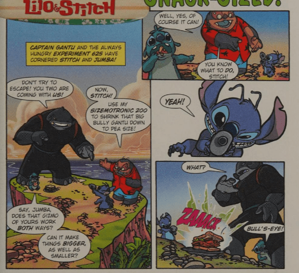 In Lilo and Stitch’s comic, Stitch uses Jumba’s sizemotronic 200 to make a sandwich increase in size. It’s stated as you can see in the picture however, that it can also shrink stuff.