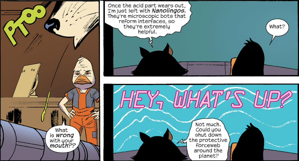 Rocket has acid capsules in his mouth which he can use to spit at opponents. Rocket’s mouth is immune to the acid due to it bonding with the user when the capsules burst. However, the acid does eventually wear out. Nanolingos are the microscopic bots that are left when the acid in his acid capsules runs out. They are capable of reforming interfaces strong enough to hold up a protective force web around a planet.