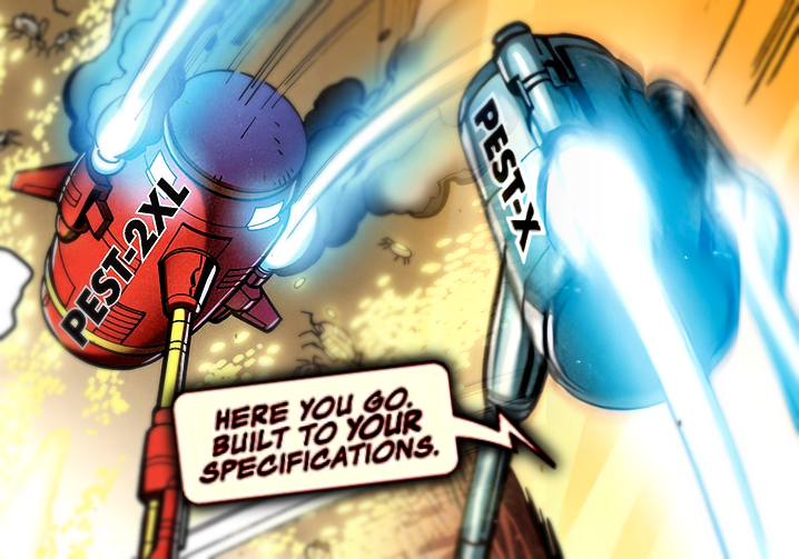 The Pest-X and Pest-2XL are essentially big, jet-boosted hammers. The 2XL was specifically made by Tony Stark to fit Rocket’s specifications, making it really strong; enough to damage alien tech that was taking hits from the Hulk and Thor.