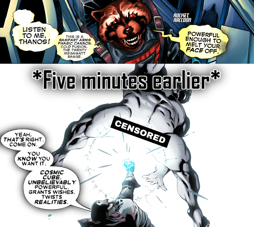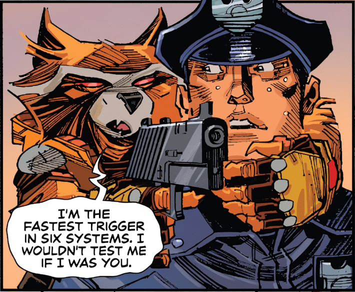 Hell, half the reason his weapons are argued to get to such an absurd level of power is because Rocket consistently hits foes with said weapons. Saying that Rocket doesn’t scale to that level of speed when he constantly is reacting to such enemies is a little silly. And we’re not saying that this means Rocket is this Marvel god who can scale to Poseidon shitting himself in planck time; instead, his considerable speed and agility should be acknowledged and accepted, from those at the lower tiers to the somewhat overbearing strength of Gladiator and Cosmic Ghost Rider.