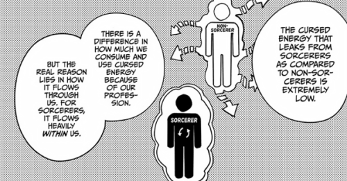 Humans who are capable of using Curse Energy for techniques called “Jujutsu” are classified as “Sorcerers” and have various special physiological attributes. Sorcerers are able to see cursed spirits that are invisible to the human eye and video capturing devices, and hear the sounds those cursed spirits make, which are normally imperceptible to humans. Also unlike humans, sorcerers are resistant to the damaging biological effects of cursed energy. The brains of sorcerers are specifically modified, which is what allows them to use cursed energy themselves in the first place.