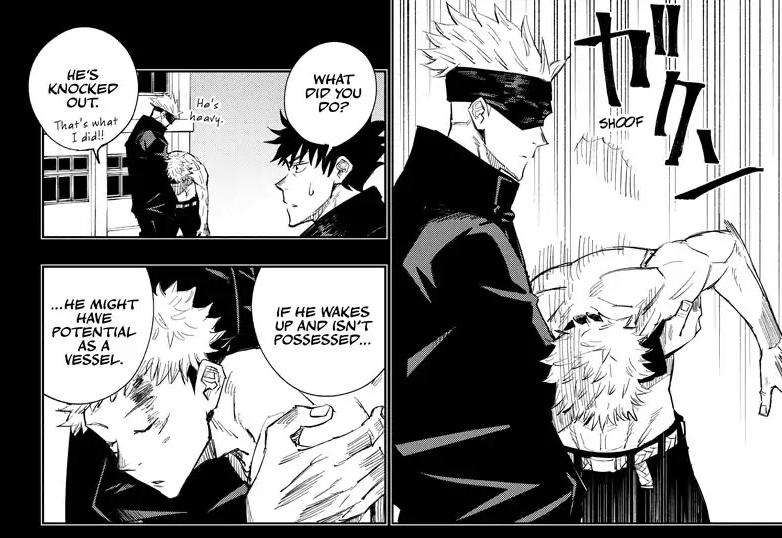 One night, Gojo encountered a young student, Yuji Itadori, who had swallowed a finger of Sukuna, an evil ancient sorcerer who lingered on as a curse in the modern day. While Yuji was originally sentenced to death in order to kill Sukuna, Gojo personally halted his execution in order to allow Yuji to continue finding and collecting Sukuna’s fingers. This was also because Gojo saw people like Yuji as a chance to change Jujutsu society for the better. He continued to teach him how to utilize Cursed Energy, though the current time of peace was destined to fade away.