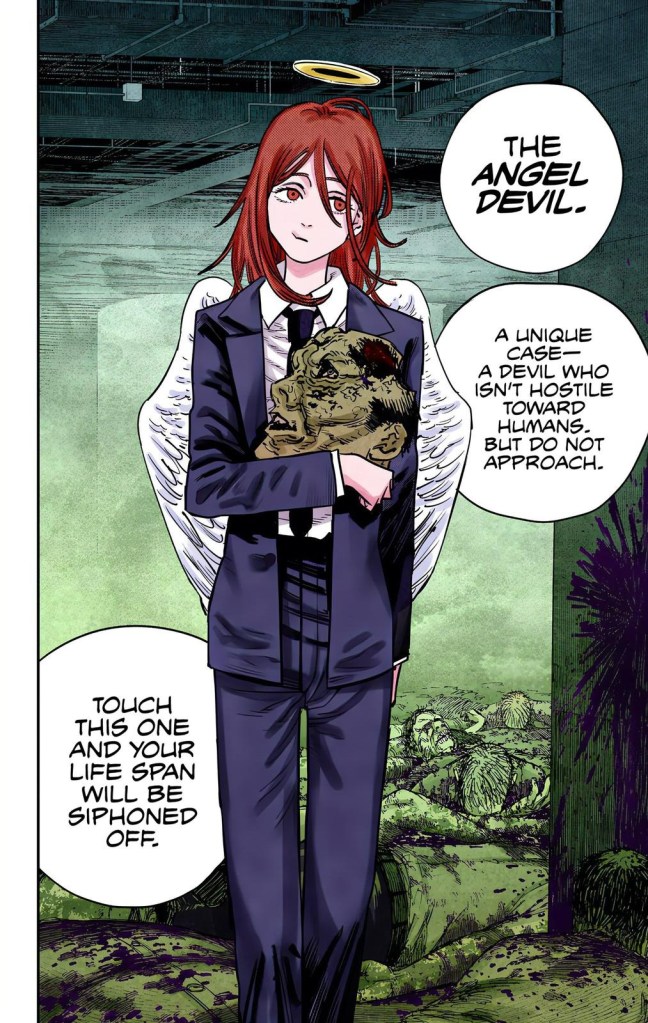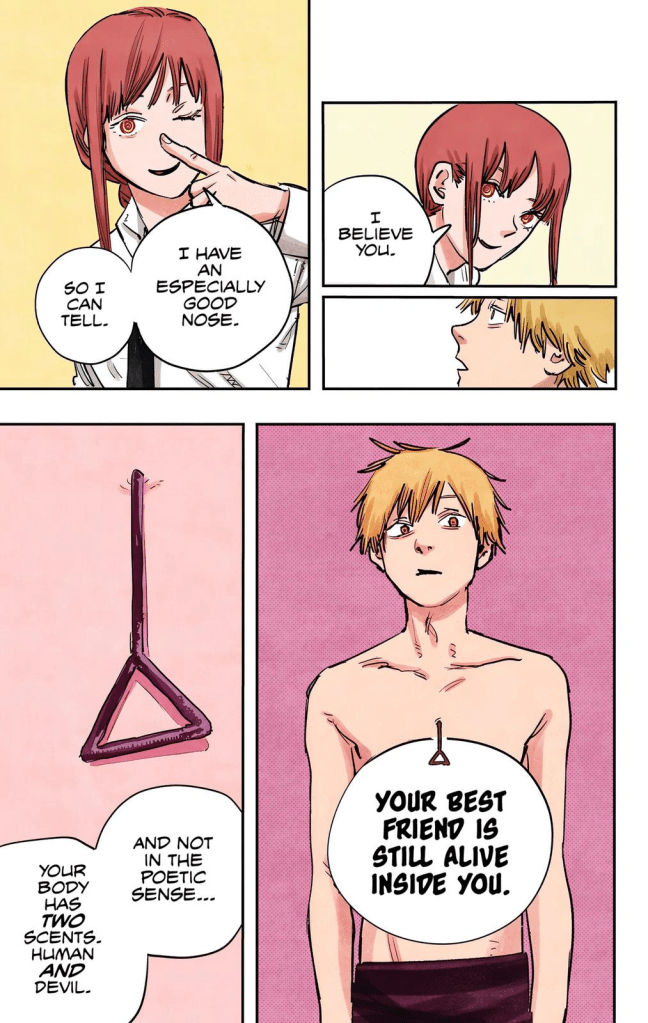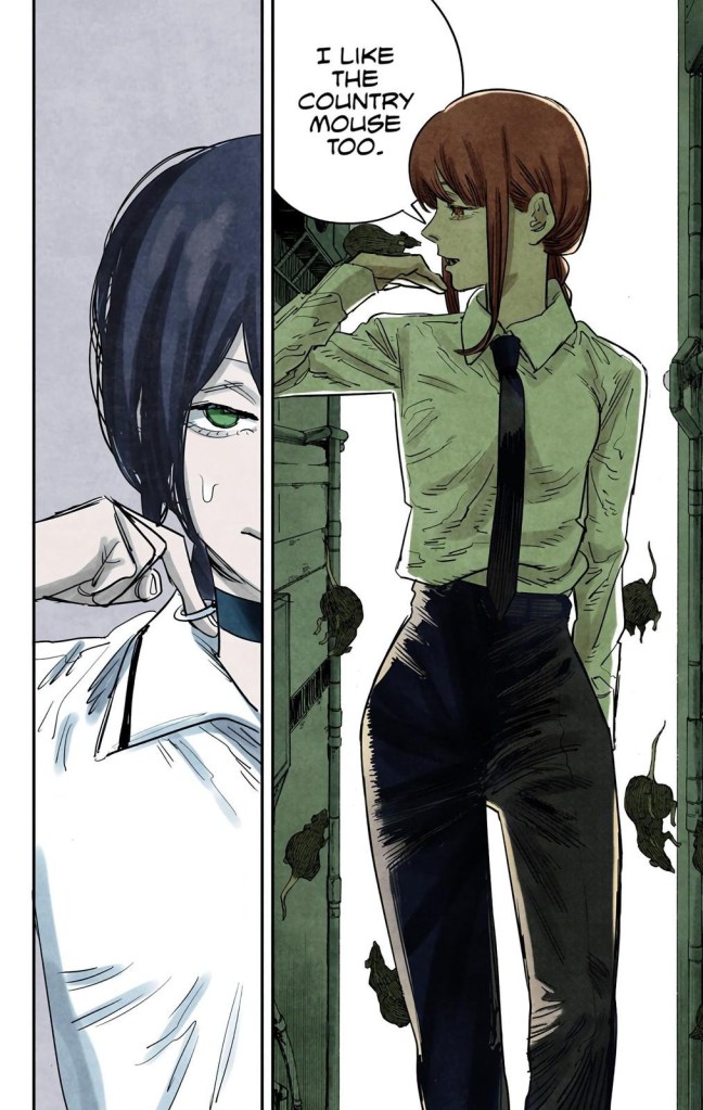 Essentially, once a Devil dies, they are reborn in an eternal cycle of reincarnation; first in hell, and when they are killed there, they resurrect on earth. When Makima was born on Earth again, she was found and raised by the Japanese government to be an asset to Devil Hunting… but that turned out to be the worst mistake they could possibly make. Makima wanted to form genuine connections and bonds with other people, but the cold and uncaring nature of her governmental “care,” as well as her status as the Control Devil, led her to only be able to express relationships through fear and domination. Now cold and empty, Makima had no genuine respect towards anything or anyone… until the Chainsaw Devil appeared.