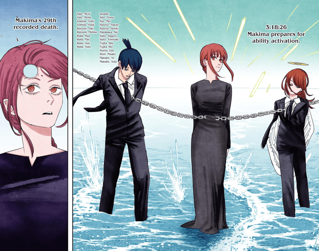 In every fight Makima participates in, she uses a combination of her summons to best counter her opposition. An example is using the Zombie Devil to counter Power’s internal blood manipulation, by bringing back her dead minions to defeat her. Makima also manipulated the entire planet to no longer fear Chainsaw Man, which weakened Pochita. She has been shown to be a skilled hand to hand fighter as well.