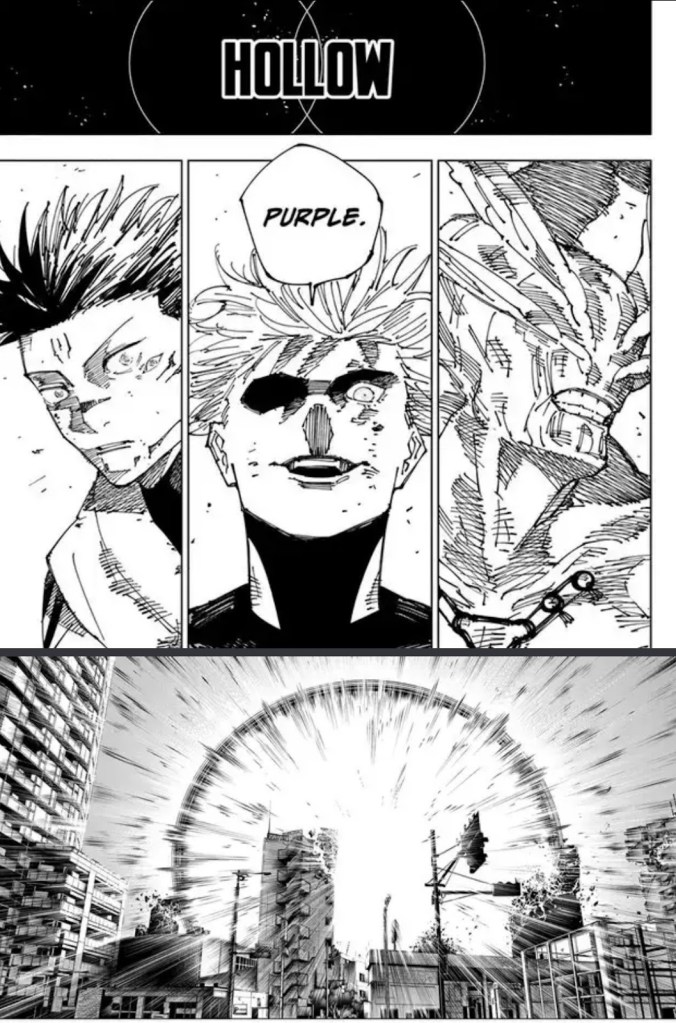 The pinnacle of the Limitless technique, a fusion of Red and Blue, of attraction and repulsion, that creates an imaginary mass that is launched at a foe, capable of absurd damage Gojo’s other techniques never could hope to match. This technique has completely ripped through the sides of Toji and Hanami, and killed Mahoraga while severely messing up Sukuna; nobody who’s seen the technique has come out without severe injury. Gojo has shown three different ways of using this technique: the normal version that shoots out a large highly destructive mass, a smaller and faster version, and a massive nuke version. Said nuke version is the most unique usage of the ability, by shooting a Reversal Red into an already existing Maximum Output: Blue, Gojo can trigger an uncontrolled explosion of energy. This explosion had a massive range and devastated a city.