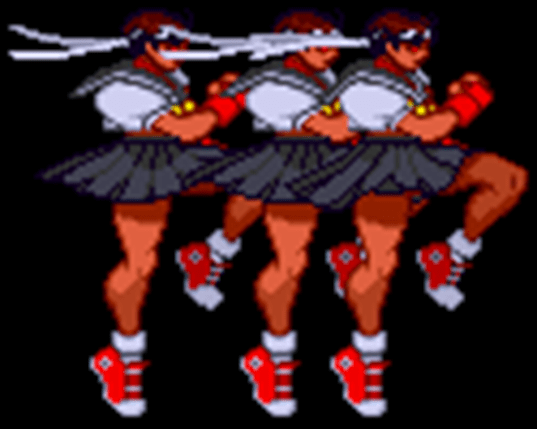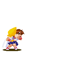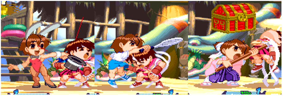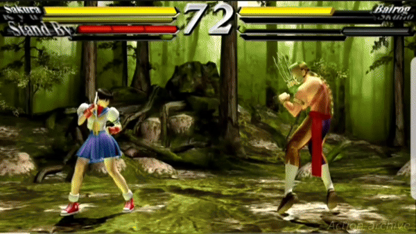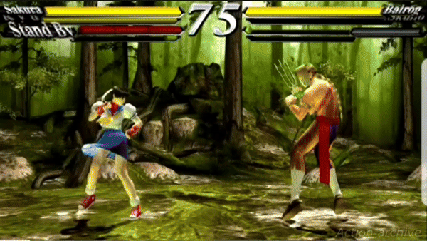 Sakura would leap forward in the air preparing to do a double axe-handle on the unfortunate opponent. If landed, she would hit the opponent three consecutive times before the opponent hits the ground defying gravity once again. While certainly a damaging move, if she misses, she will lose her balance, making her vulnerable if she’s not careful.