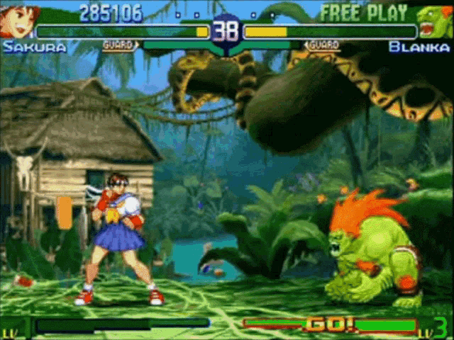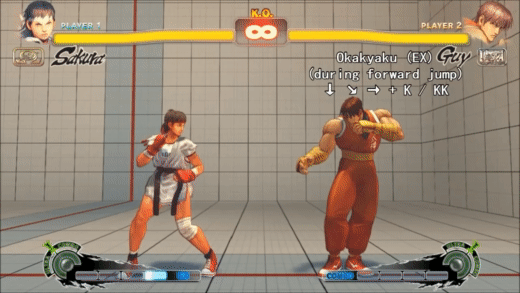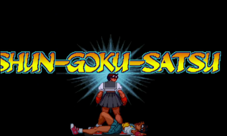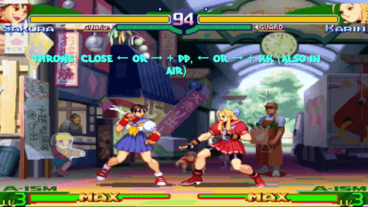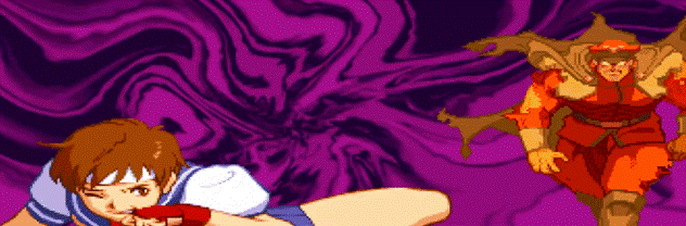 Sakura fires a very fast and powerful, large Hadoken with a pink color (ignore the fact that it’s red here, it’s just the charge up) that inflicts even more damage than a Shinku Hadoken and any other move in the game. It can only be used when her energy meter is at maximum.