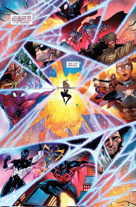 …until, somehow, Gwen came to the realization that absorbing the life force of her alternate selves linked her to all of their timelines turning her into a multiverse capable of creating webs “made out of eternities” that Gwen would use to hold the multiverse together (as shown above) and save the day!