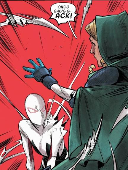 Ah, the infamous scan of Gwen holding together the Marvel multiverse. For some context, a pop idol from the end of time, Finale, accidentally struck Gwen with temporal energy and altered her timeline, as well as creating five additional timelines with their own unique histories revolving around their iterations of Gwen Stacy. Towards the end of the storyline, we see that the creation of the Gwenverse and Finale’s own recklessness with the fabric of space-time begins to break apart the multiverse itself, unraveling backwards from the end of time. In an attempt to fix this, Gwen uses a device to absorb the life force of all the other Gwens to try and go back in time to stop Finale moments before the multiverse unravels itself. However, this proves to not be enough and all seems lost for our heroine…