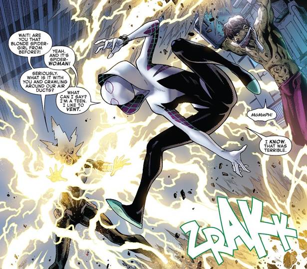 In the world of Earth-65, you wouldn’t think much is different. However when you get to the grounded stuff, the individual, you start to see something’s off. The famous and fantastic Reed Richards was only a 13 year old. Daredevil? Now aiding the Kingpin instead. However, the craziest of all was that Spider-Man or on this Earth, Ghost Spider was a killer. And who is this Ghost Spider? The amazing Gwen Stacy. On this Earth, Gwen is a normal girl. She goes to high school, even plays drums for a band called the Mary Janes. One day this would all be flipped upside down when she was bitten by a radioactive spider which gave her superpowers. Using these great powers, she responsibly took the streets to fight crime as Spider-Woman (she has a lot of aliases).
