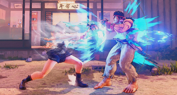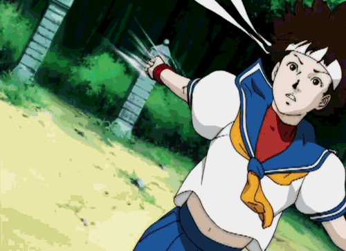 Sakura envelops her hands with the same energy from her Hadouken, but instead of a projectile, she does a double palm thrust, knocking the opponent back. She can charge this move to increase its size and strength. The EX version is stronger, bigger and instead of a double palm thrust, she straight up DECKS the poor opponent. This move only hits in front of her, however whoever she hits will instantly be knocked down.