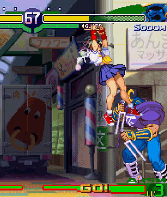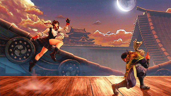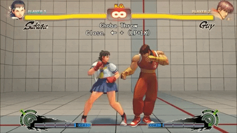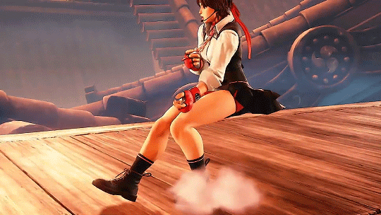 Sakura jumps into the air a bit before swiftly floating down with a series of spinning kick(s). While Sakura’s version of the hurricane kick doesn’t exactly have her travel across the screen and defy gravity, it’s still a handy move for getting past projectiles and ending combos. Some variants like the EX version of it even allow follow ups for cool combo extensions.