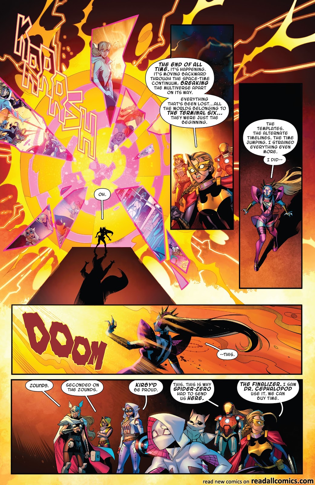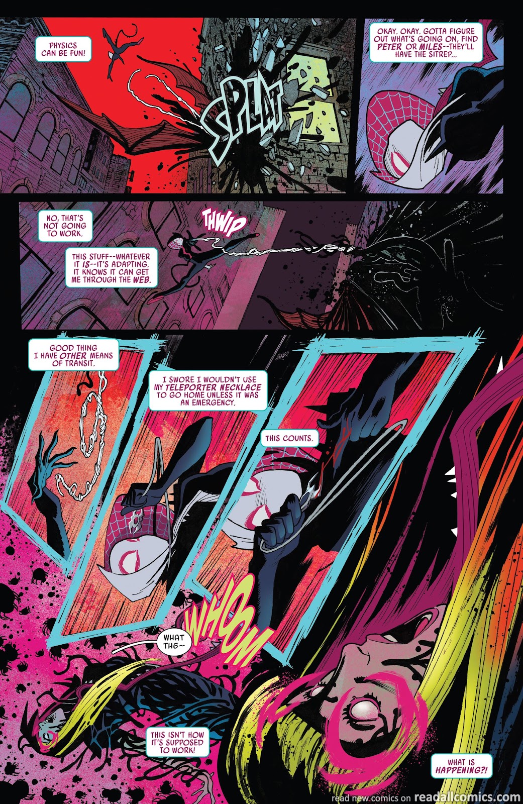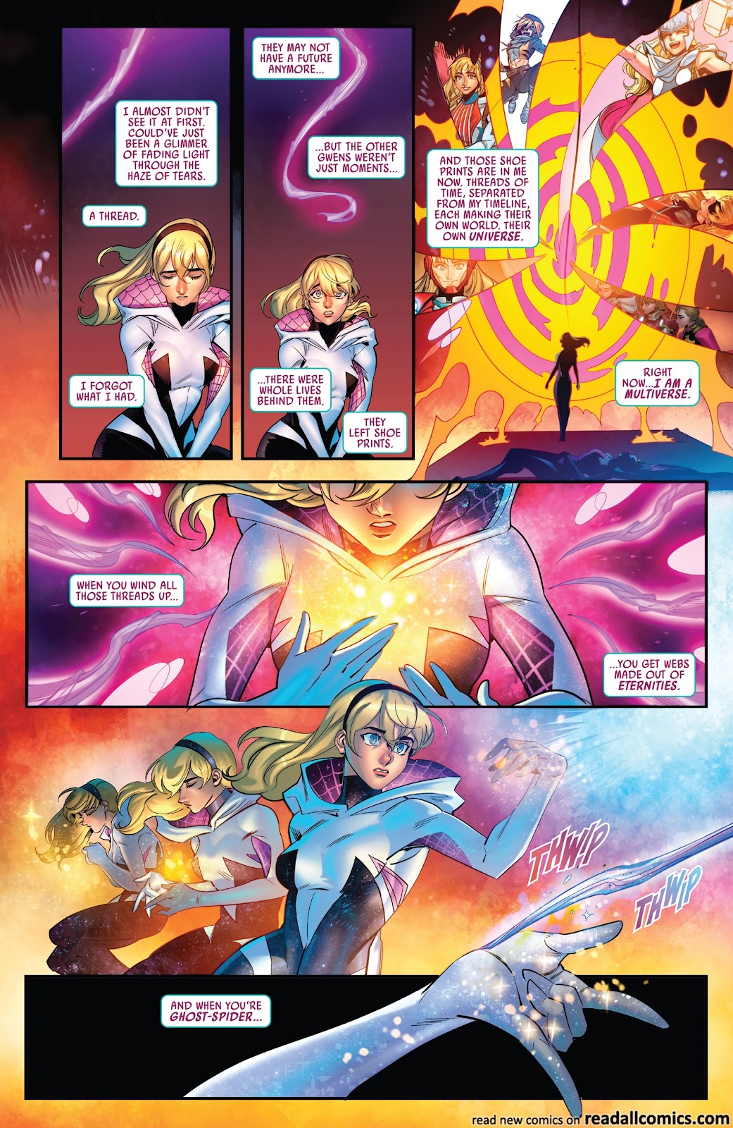 …until, somehow, Gwen came to the realization that absorbing the life force of her alternate selves linked her to all of their timelines turning her into a multiverse capable of creating webs “made out of eternities” that Gwen would use to hold the multiverse together (as shown above) and save the day!
