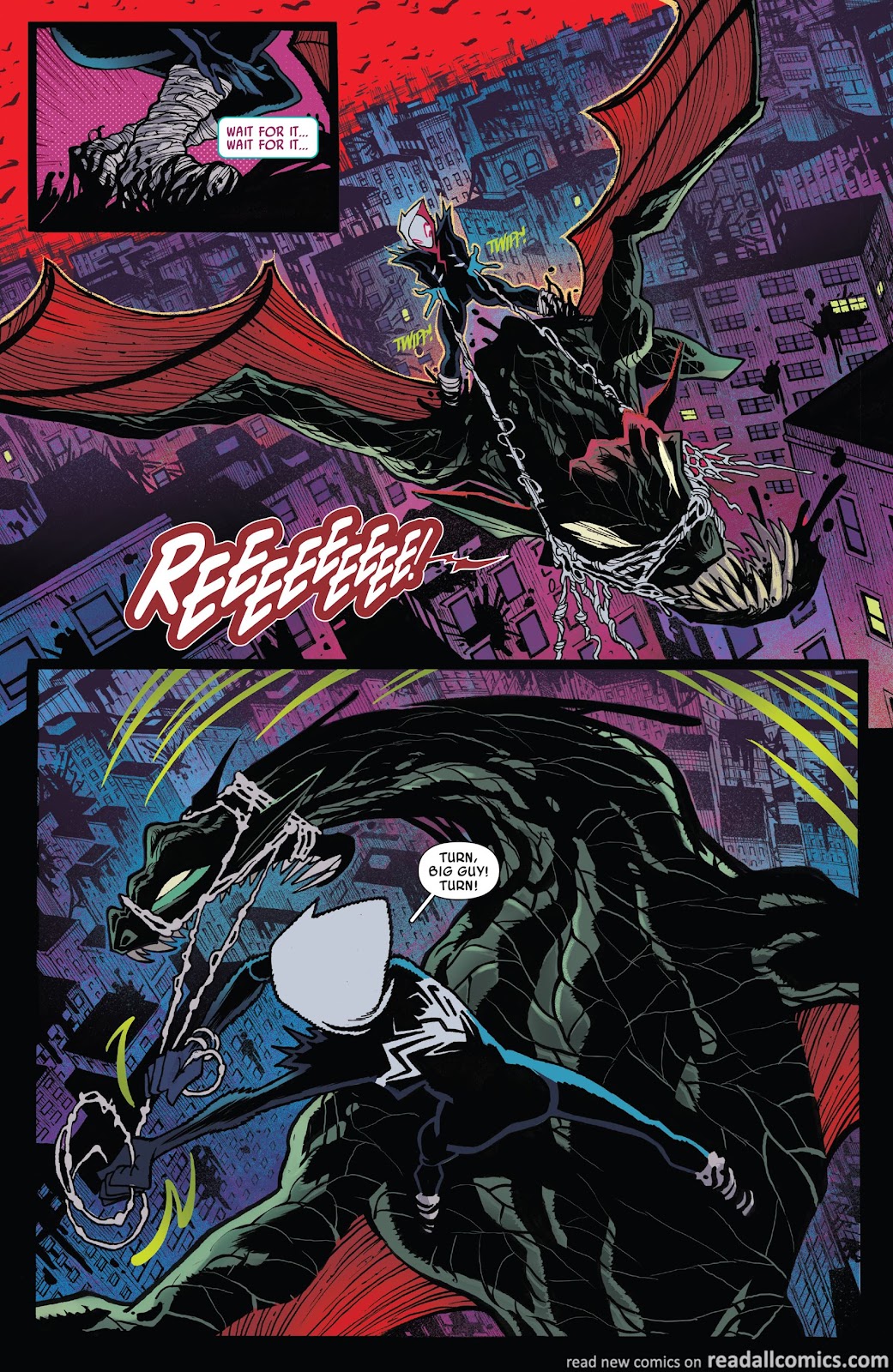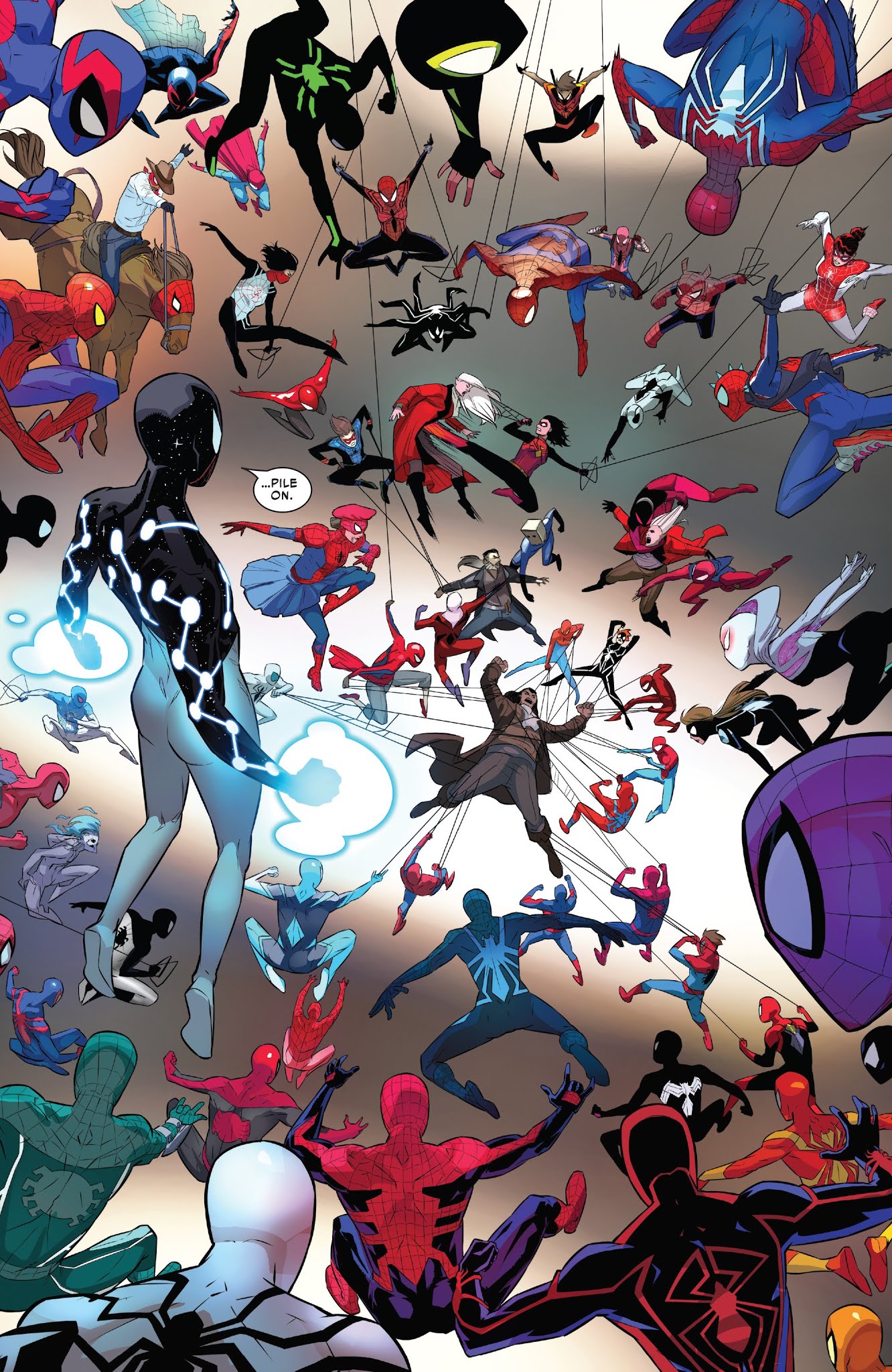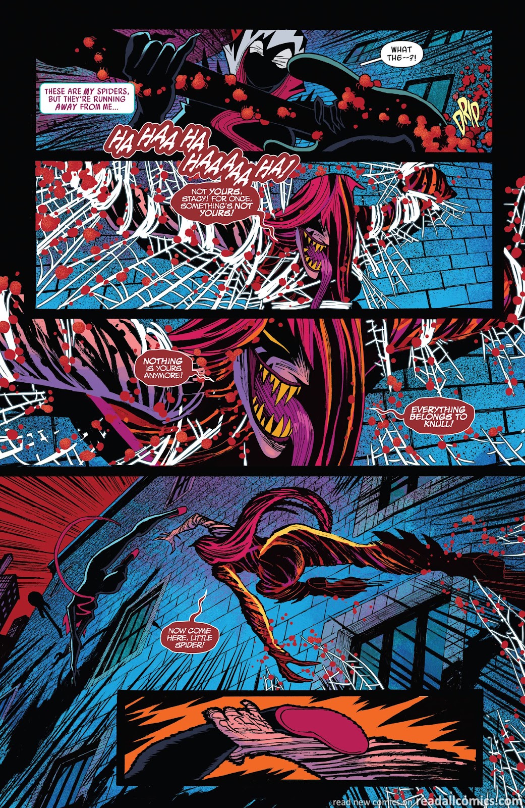 …until, somehow, Gwen came to the realization that absorbing the life force of her alternate selves linked her to all of their timelines turning her into a multiverse capable of creating webs “made out of eternities” that Gwen would use to hold the multiverse together (as shown above) and save the day!