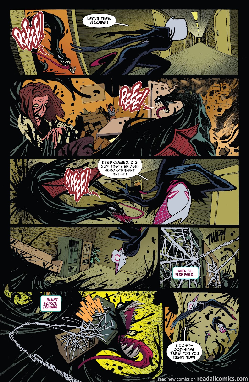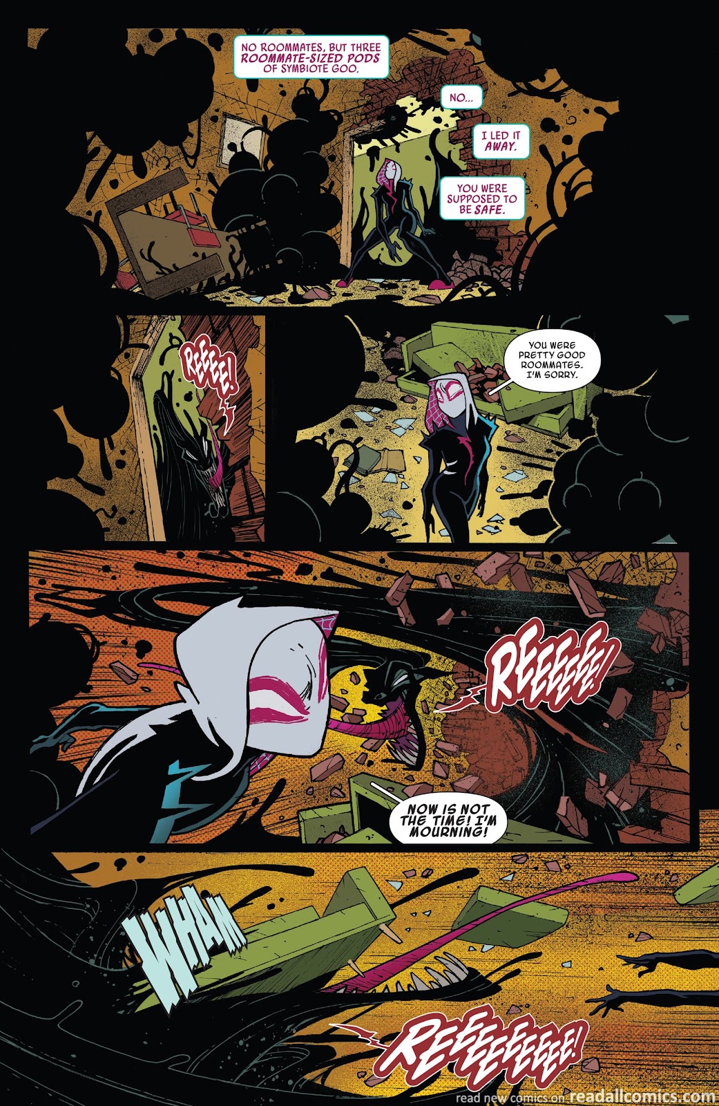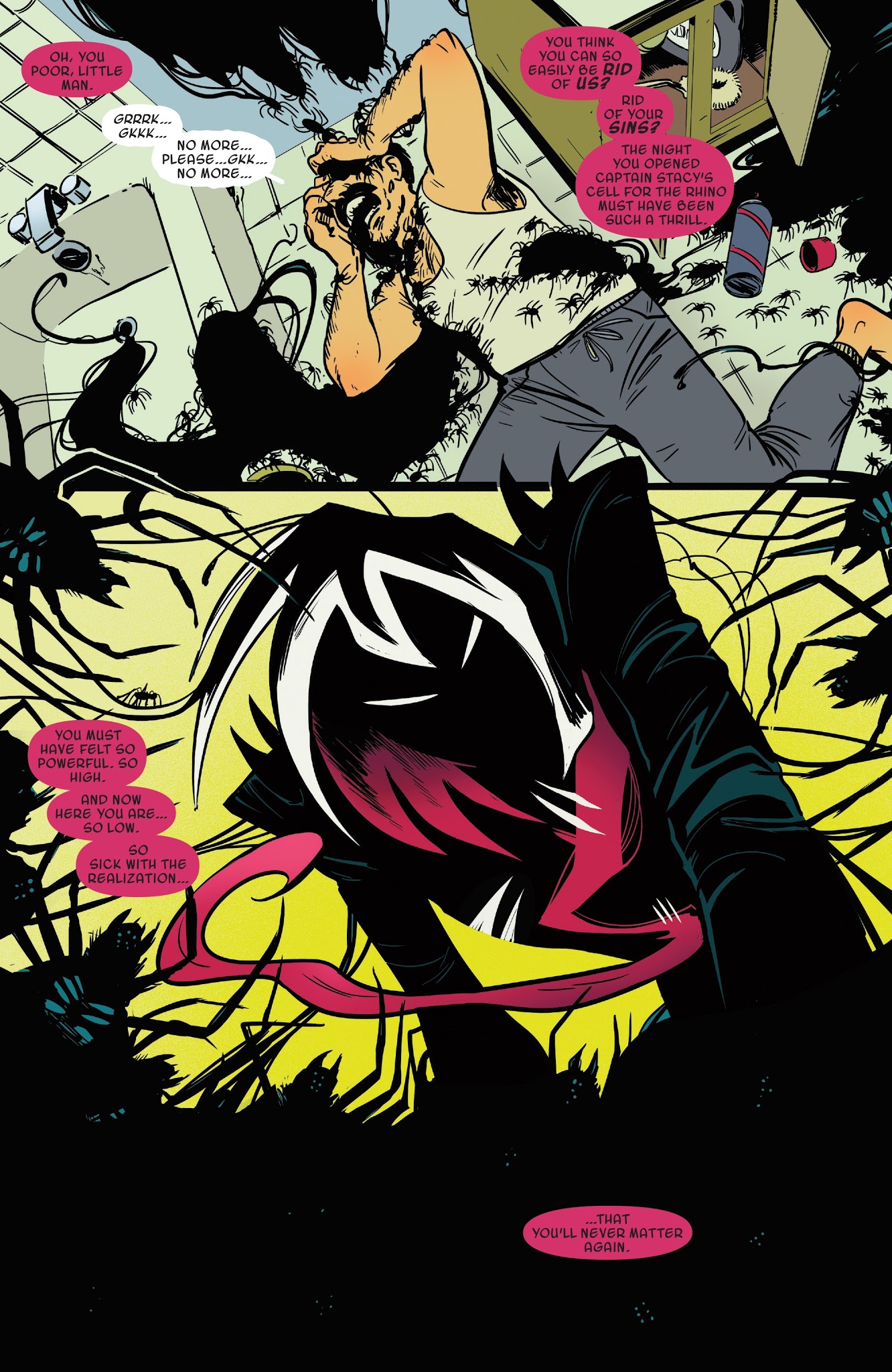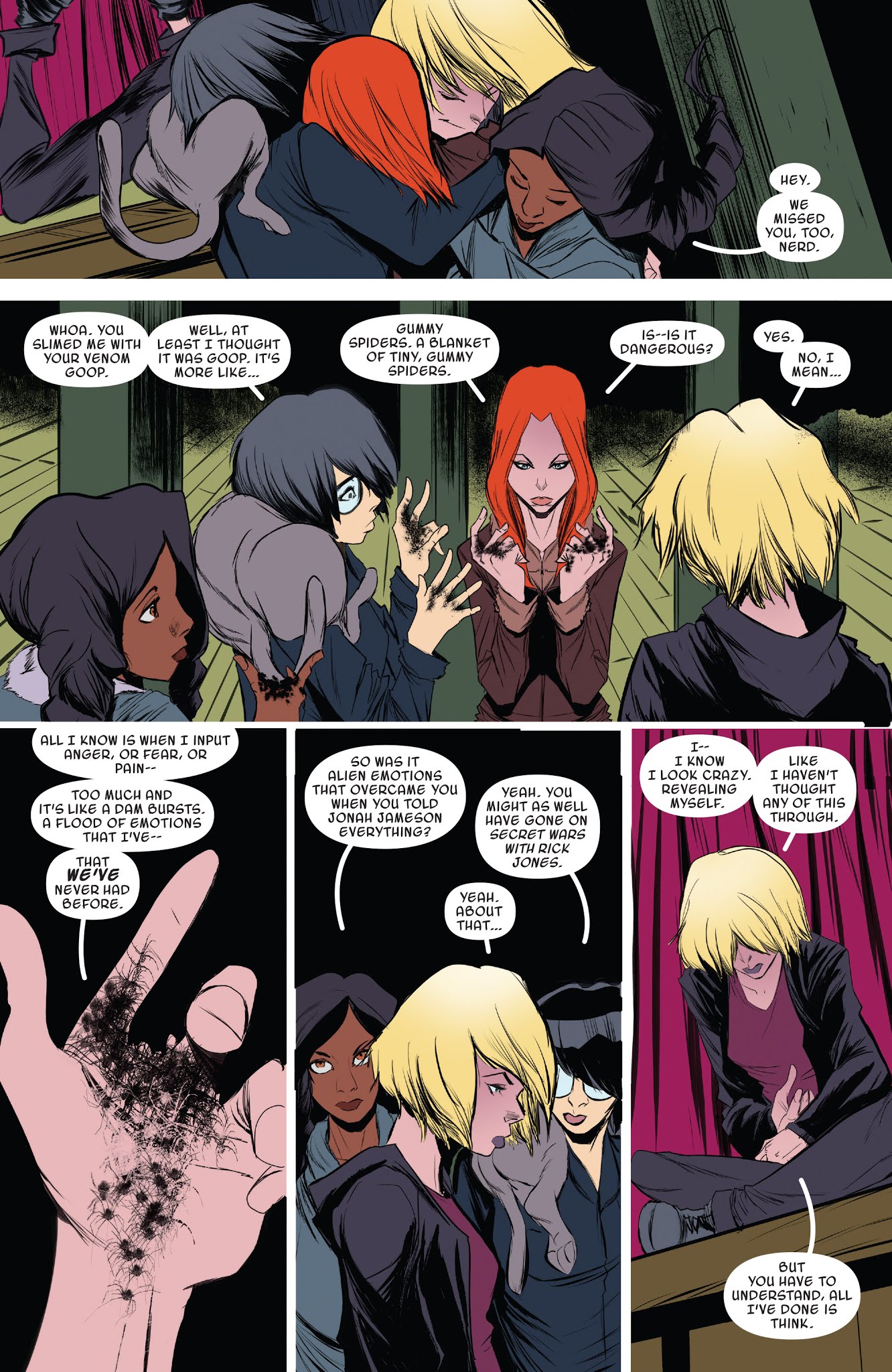 The symbiote itself is also technically not a singular entity. It’s made out of a ton of tiny spiders that Gwen has full control of. These tiny “gummy” spiders can survive long periods on their own separated from Gwen and can stick/have them follow individuals for Gwen to spy on.