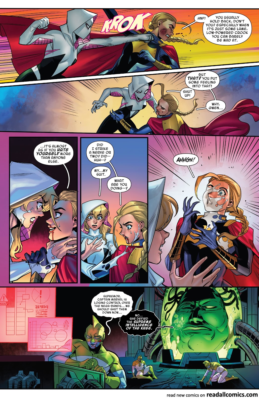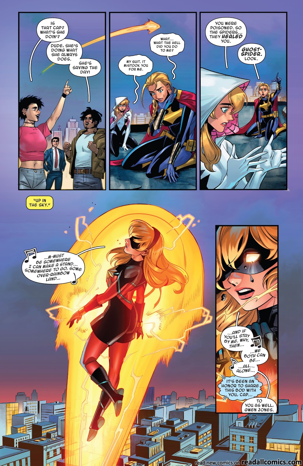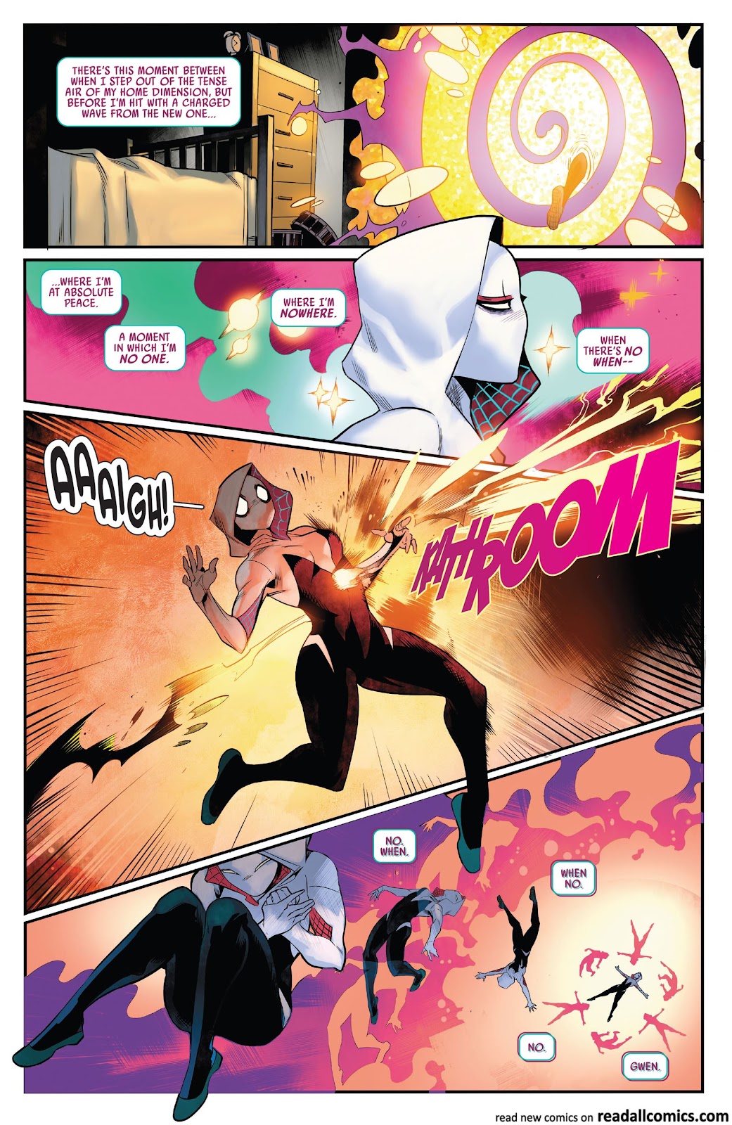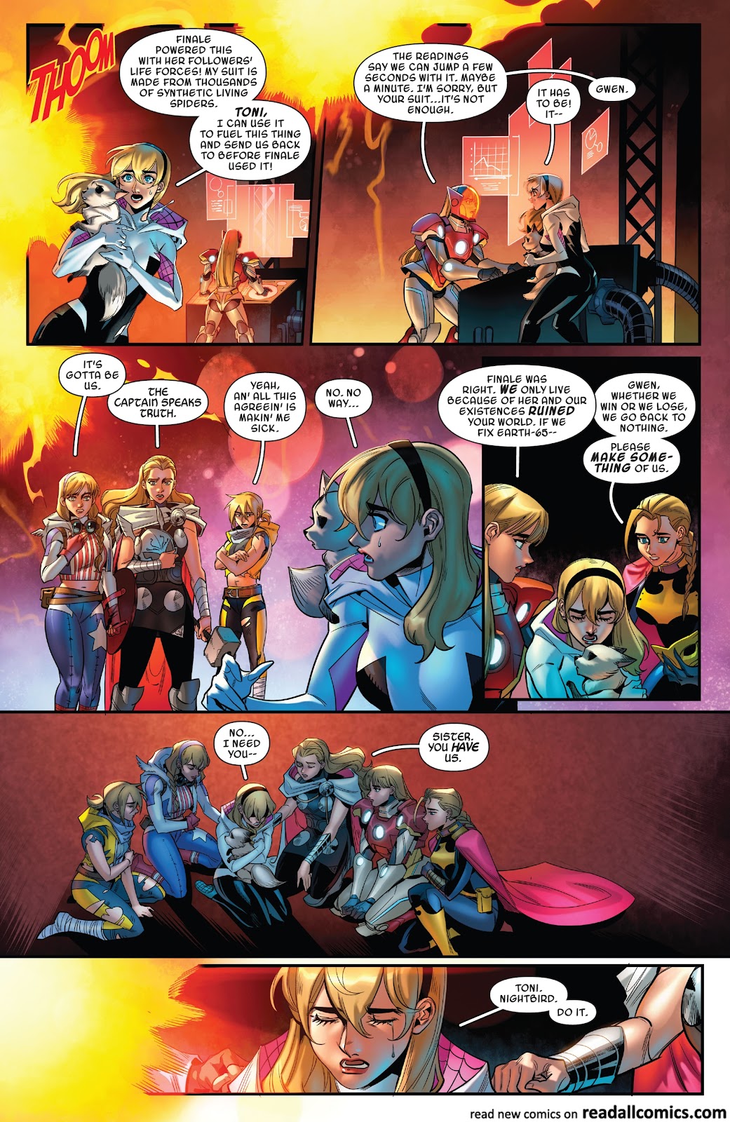 Ah, the infamous scan of Gwen holding together the Marvel multiverse. For some context, a pop idol from the end of time, Finale, accidentally struck Gwen with temporal energy and altered her timeline, as well as creating five additional timelines with their own unique histories revolving around their iterations of Gwen Stacy. Towards the end of the storyline, we see that the creation of the Gwenverse and Finale’s own recklessness with the fabric of space-time begins to break apart the multiverse itself, unraveling backwards from the end of time. In an attempt to fix this, Gwen uses a device to absorb the life force of all the other Gwens to try and go back in time to stop Finale moments before the multiverse unravels itself. However, this proves to not be enough and all seems lost for our heroine…