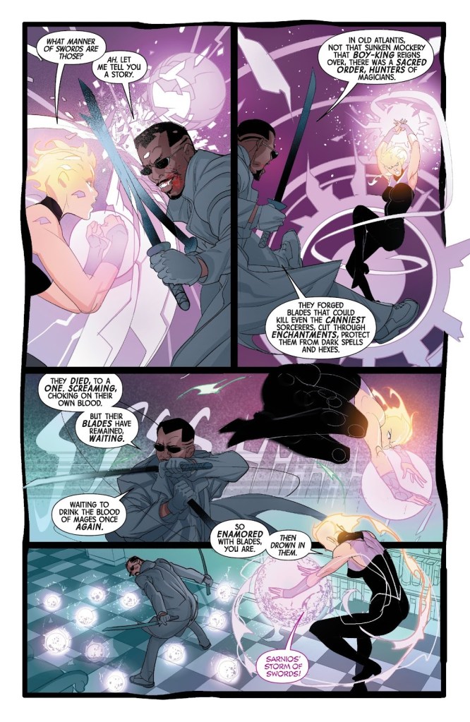 When he was possessed by Varnae during the events of Bloodhunt, Blade wielded two blades forged in Old Atlantis made with the purpose of killing magicians. As Blade (or Varnae I guess) says above, the swords could cut through enchantments and protect the user from dark spells and hexes. The swords were able to cut through Clea’s magic, forcing her to fight Varnae with a Blade of her own.