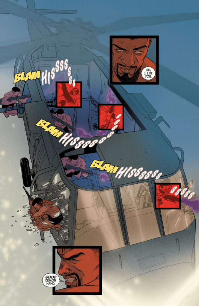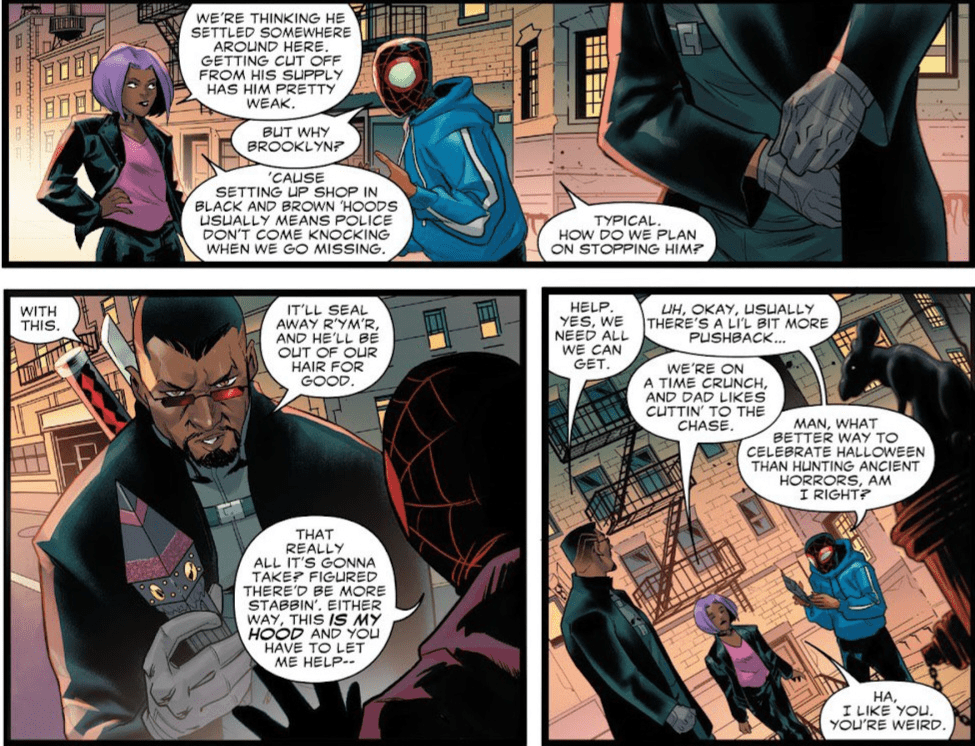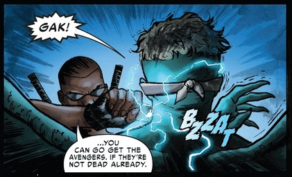 Blade’s experience has also formed him into an expert tactician and pragmatic fighter. He can track down the likes of Angela after tracking her for an hour, fearlessly leaping out of a plane to take out airborne vampires despite not knowing if he can fly yet, or learning how to ride a…dark elf horse. Tapping into his half-vampire self, Blade is also extremely stealthy, capable of breaking into an alternate reality’s Pentagon for coordinates, sneaking into Castle Doom undetected and stealth past Dark-Doom (the entirely evil half of Doom), sneaking up on armed soldiers, and disappearing from view of a suspected mercenary, only to appear right behind her.