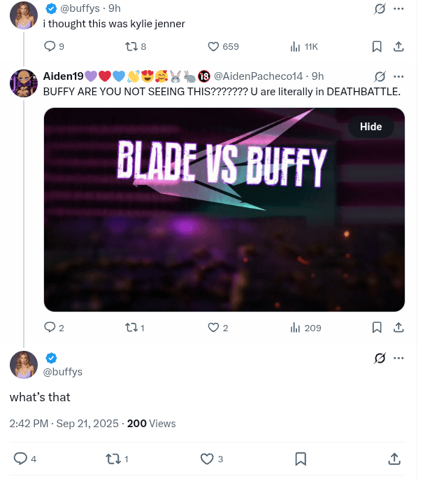 While both are relative enough in speeds, Buffy’s immense strength would let any blow she deals be fatal to Blade compared to the Daywalker’s more specific means to score the kill, especially when many of those weapons would largely prove ineffective. Outside of weapons like Justiciar and the Hellfire Shotgun, Blade’s arsenal is either resisted, overpowered by the Scythe, or just not going to work at all like the Breathing Gun. This leaves Blade largely with only defensive measures to score the dub such as evading with the mist, but Buffy’s greatest asset to shut down those means would be her vast array of skill and experience as a Slayer. Between her direct showings in combat, fights against other fighters with similar skillsets and powers to Blade, and having access to the entire library of Slayers across history, Buffy would have the time and means necessary to outmaneuver Blade properly to stop his evasive maneuvers and score the kill properly.