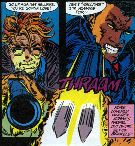 If up close and personal isn’t cutting it, then Blade is more than happy to pump a vampire full of silver lead. Blade has a wide assortment of firearms, ranging from walls of standard machine guns or submachine guns, but he has a few firearms that are meant for vampires. He has double-barrel shotguns that shoot wooden stakes in the barrel sets, a crossbow, a giant stake launcher, an automatic tranquilizer dart gun, and a pair of submachine guns with “hollow point miniature stakes filled with holy water”.