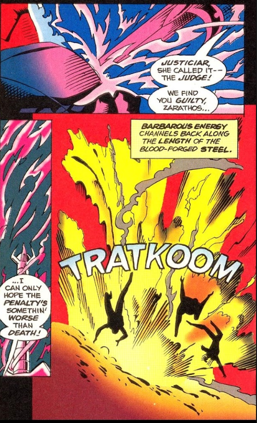 The exception though, to Blades arsenal overpowering Buffy’s own though, is the Scythe, Buffy’s strongest tool and capable of tearing through anything Blade has. As scaling to 12th Dimensional AP would be above the Secondary Adamantium weapons like the Odachi or Stake Launcher scaling to Ultron Bodies and The Hulk(both of whom tend to vary), the Hellfire Shotgun only damaging a base Robbie Reyes Hellcharger, and the Old Atlantis Sword being… more of a haxier weapon then a sheer strength based weapon in it nullifying magic. Sorta meaning that Blades arsenal would fall flat against the sheer power of the Scythe if they were to clash… Except for one tool. The Justiciar, a blade forged for Blade specifically that is strong enough to kill the likes of Zarathos even, and considering the sheer cosmology level threat that Zarathos is, the Justiciar is a weapon that far exceeds everything else in Blade’s arsenal by a mile.