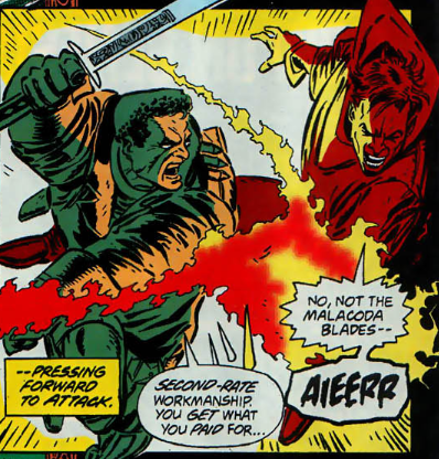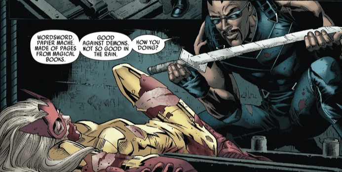 The Wordsword, stated to be made out of pages from magical books, is a unique tool in Blades arsenal, capable of hurting Plokta and threatening Plotka. Impressive, not only considering that Plokta is normally immaterial, but Plokta is a Duke of Hell and is responsible for a magical principle of the universe, and he drew power from the Dream Corridor, an infinite sized dimension. Plokta claims that Blade’s Wordsword is the only thing that could have hurt them, likely through its special properties since Blade concedes Plokta is too much for the squad on their own.