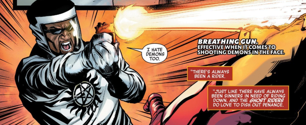 As for its power? It’s truly something to behold. It’s been a threat to Hellstorm, the son of Satan, killed Inanna, a Archdemon, and it’s been deemed more powerful than a Hellfire Shotgun, and has actively harmed even someone as strong as the Cosmic Ghost Rider, who was imbued with the Power Cosmic. Fitting, considering its especially good against demonic entities. Though it’s not limited to only being able to hurt Demonic entities, as it was capable of threatening a relatively simple human like Madcap, or outright killing Doctor Druid. Showing that while it’s super effective on demonic entities, the gun does not limit itself to only slaying the Demonic with its insane firepower.