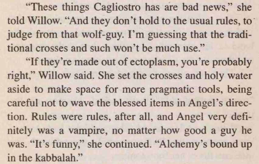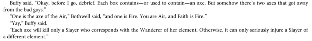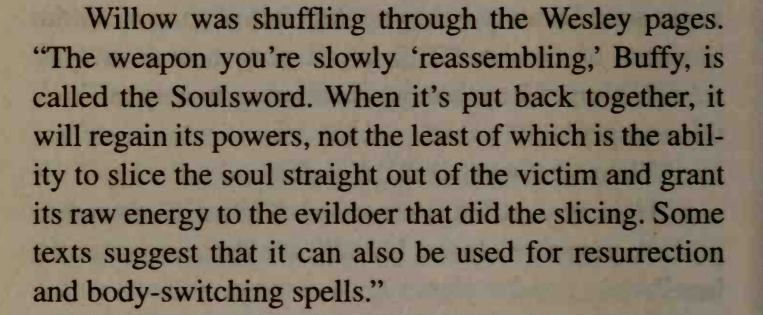 Now, how does this relate to Buffy? Well, before we touch on that, let’s address the common argument for why it would work: Spike’s microchip that only lets him hurt demons identifying Buffy as one after she was resurrected. This is, by itself, a fine argument, however, there is a much more blatant citation to the contrary in, shocker, one of those 128 novels.