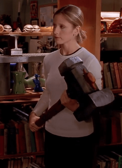 What best defines Buffy however, and what separates her from every Slayer before her, is how creative and unpredictable she is. She is good at efficient traditional maneuvers of course, excelling at disarming both close and long-ranged weapons, feints, defensive tactics, environmental analysis, you get it. But she has a tendency to think… outside the box? On the spot she crafted Molotov cocktails, or used a can of hair spray to turn a burning cross into a holy flamethrower. Buffy can also seem to make an on the spot stake out of basically anything wooden, would it be a guitar head or a ripped off piece of a torch. But sometimes it just gets outright crazy, like when she improvised using a hooked tube cable as a whip, willingly infected herself with a virus so she could see an invisible demon, and ripping off her arm when her mind was inside a robot to break out of restraints (don’t ask). It helps that she has crazy precision with tools both small and big, would it be spitting out a pushpin to stab a fly, or throwing a battle axe at a tree to knock down a big spider (or just at a demon like normal). Her greatest strength though is that Buffy is empowered by her emotions in combat, angering her to maintain activity and the determination to find any win condition she can. This in conjunction with her imagination is what Buffy highlights as her best traits, outdoing the extra extensive training and isolation of another Slayer like Kendra.