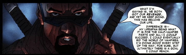 As a fighter, Blade not only has blades, but he’s got hands. He is a competent hand-to-hand combatant, considering himself a “seasoned street fighter” capable of performing aerial kicks and punches, sometimes acrobatically rolling with the punch in order to put himself at a distance to be able to throw his knife. He continued his training by fighting and training with Divinity Drake/Aamshed, who is an expert in Hapkido. He eventually became good enough to teach his daughter Brielle how to fight. And when it comes to his knives and swords, you can bet Blade is a master. Blade is extremely skilled in knife throwing, and can handle or use any throwing knife he gets his hands on, which is fair, considering he’s stated to be proficient in every form of weapon known to Man. He is stated to be as good with throwing knives as a martial artist is good with his hands. He can even precisely throw his swords at the heads of creatures and into the hearts of vampires from short distances.